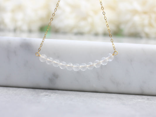 Quartz gemstone necklace in silver or gold.