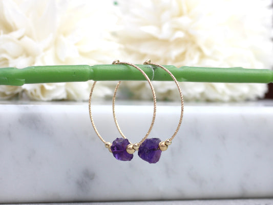 Raw amethyst hoop earrings in sterling silver or gold.