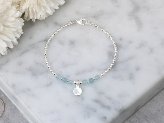 Aquamarine initial gemstone bracelet in silver.