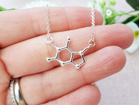 Chocolate molecule necklace in sterling silver. Can be personalised.