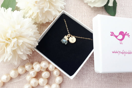 Raw Gold-Plated Aquamarine Necklace with Hand Stamped Initial