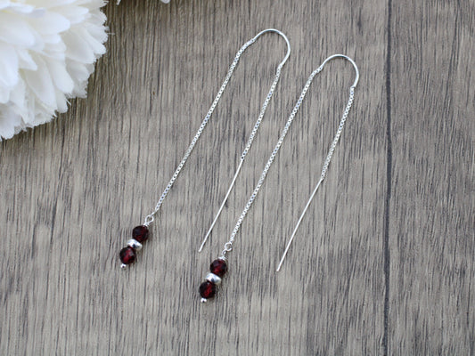 January birthstone earrings. Garnet threader earrings.