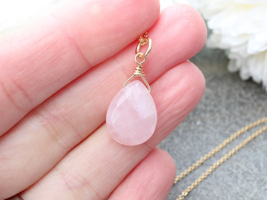 Rose Quartz Teardrop Briolette Necklace in Gold Filled | Wire Wrapped Pink Gemstone Pendant | Gift for Her