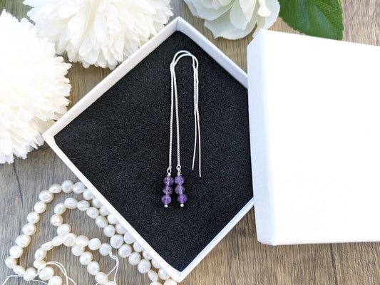 Amethyst thread through earrings in sterling silver.