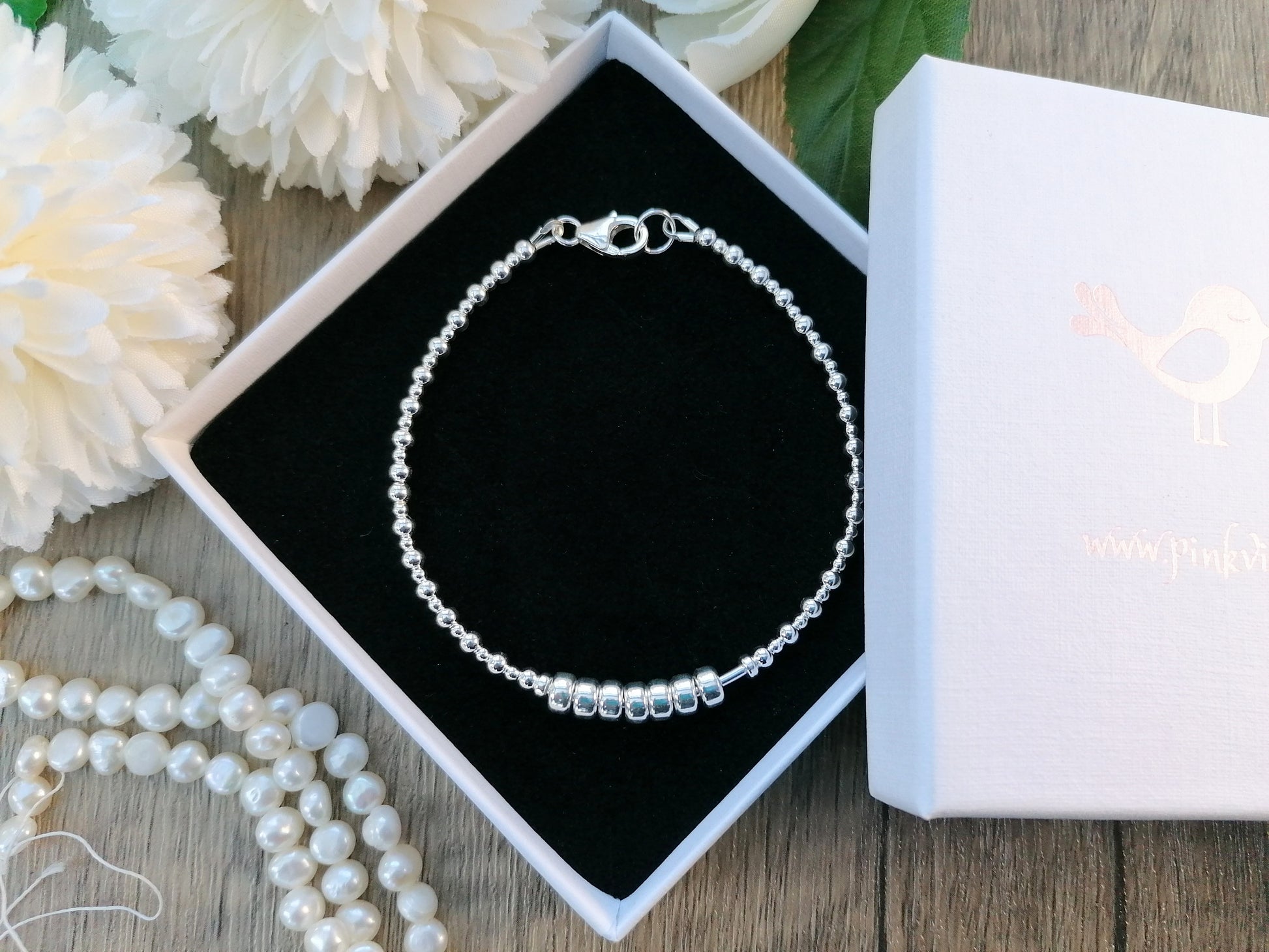 Celebrate this amazing milestone with this unique 70th birthday bracelet. Handcrafted with sterling silver beads, this kinetic bracelet has one bead for every decade. The centre beads move freely for an added touch of magic. A perfect 70th birthday gift!