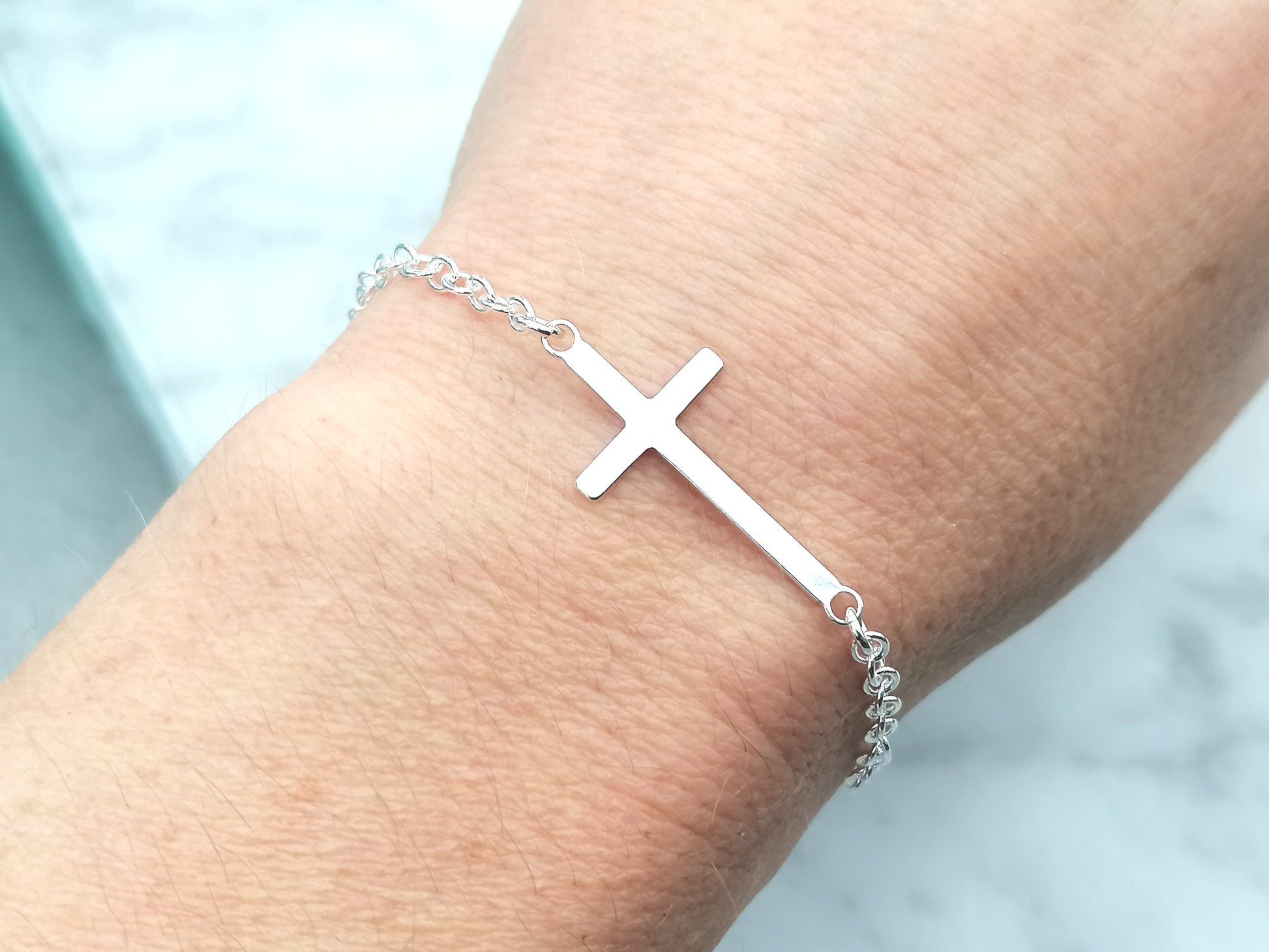 Celebrate your faith with our sterling silver sideways cross bracelet. With its adjustable design, it can make a meaningful holy communion or confirmation gift for any age or a lovely treat for yourself. This simple yet elegant piece is crafted to last and symbolises faith and devotion.
