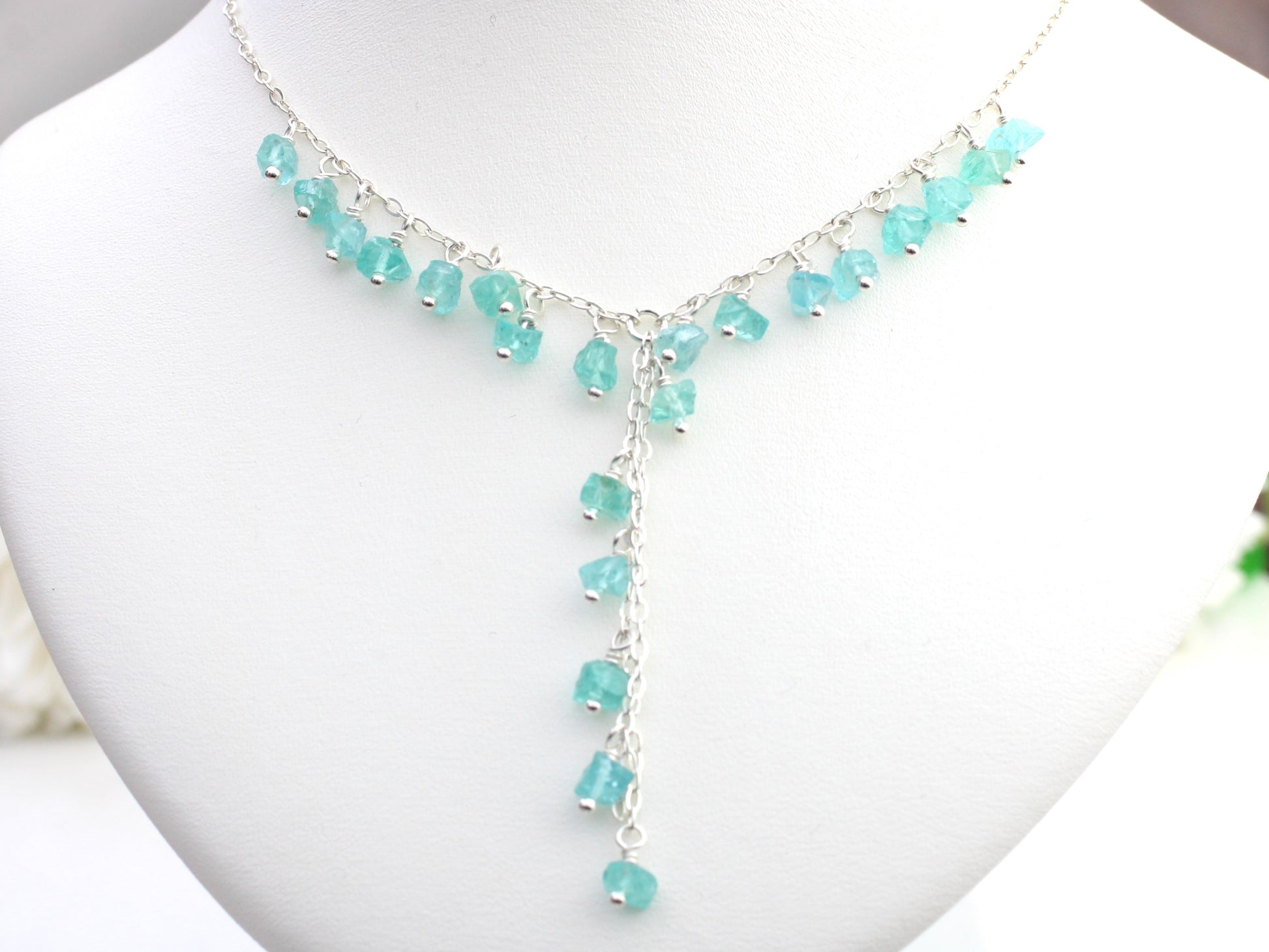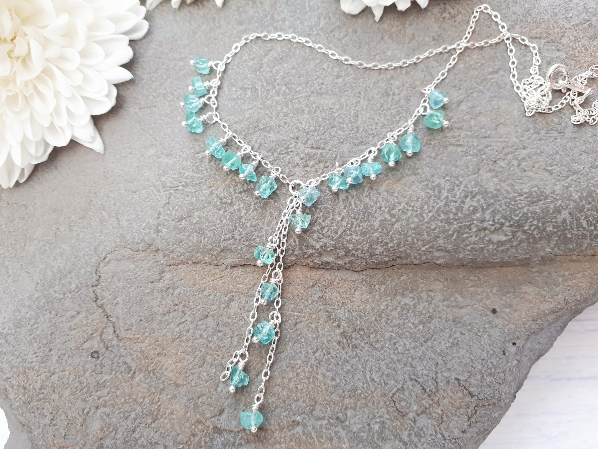 I have made this beautiful necklace using raw apatite gemstones which have been attached with sterling silver wire onto sterling silver chain.