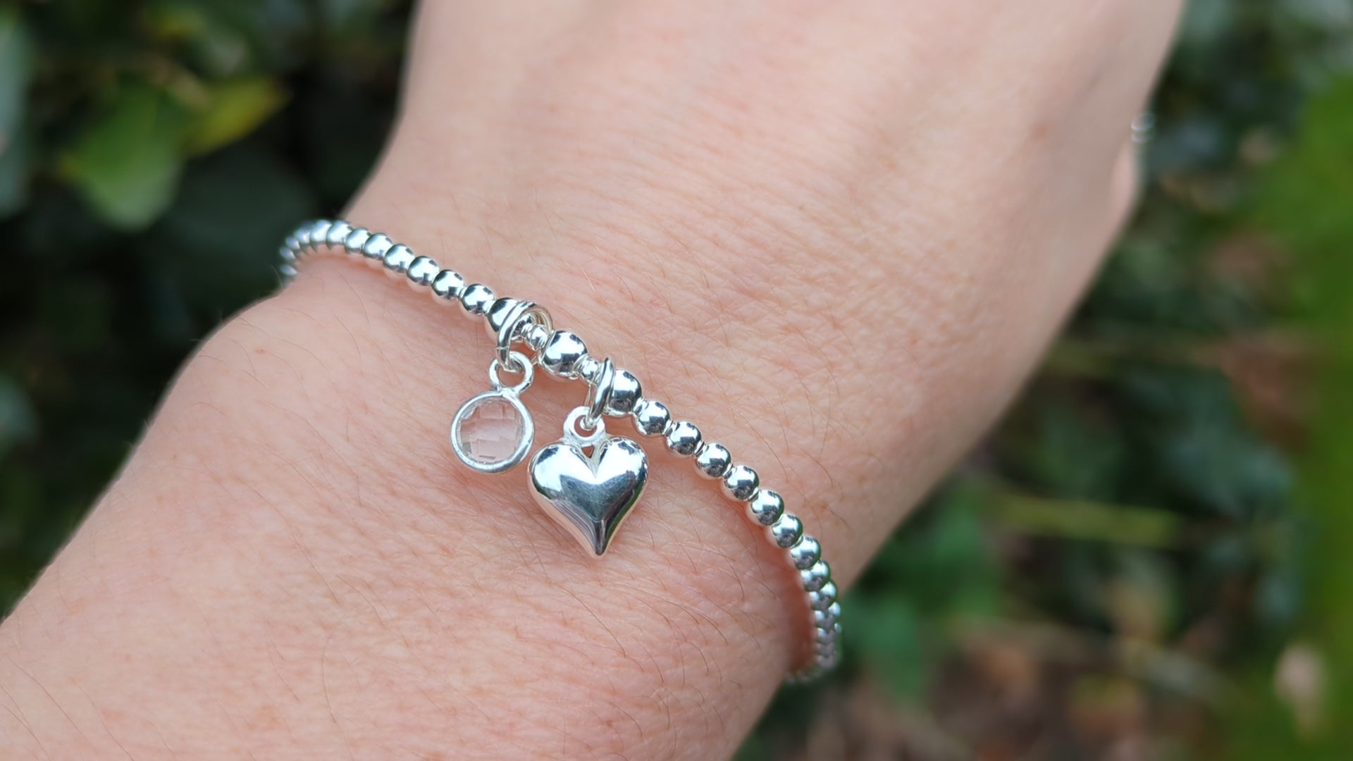 Give the gift of beauty and love with our April birthstone bracelet. Made with a sterling silver heart charm with he choice of a sparkling Swarovski clear crystal or a natural quartz gemstone charm, it symbolizes the birth month of April. With sterling silver beads and a stretch design, it's not just stylish, but also comfortable to wear.