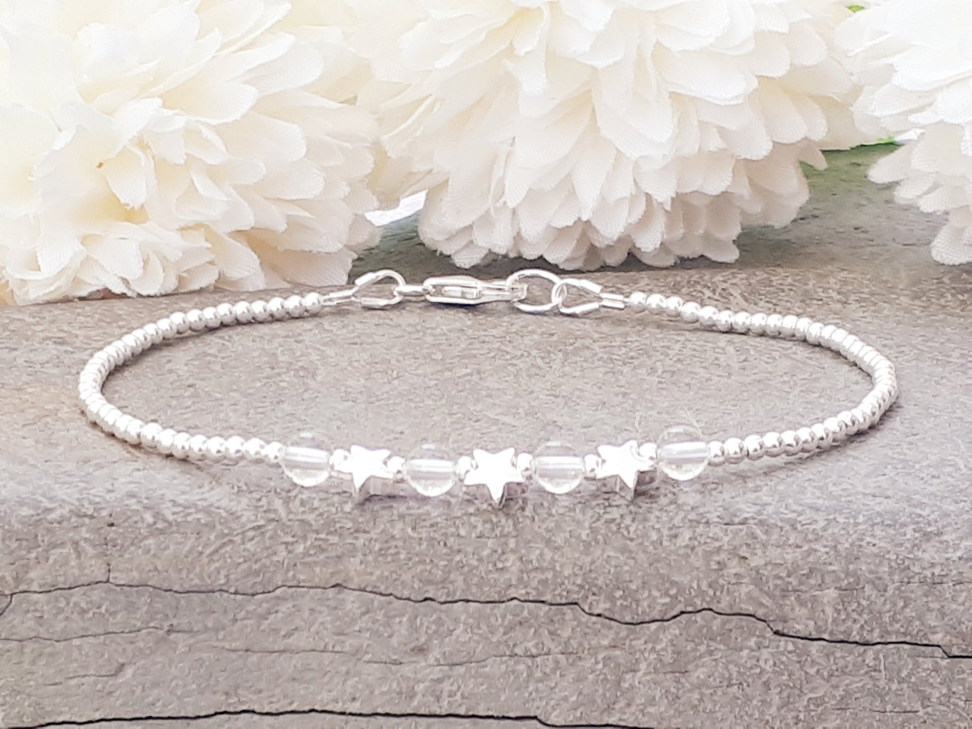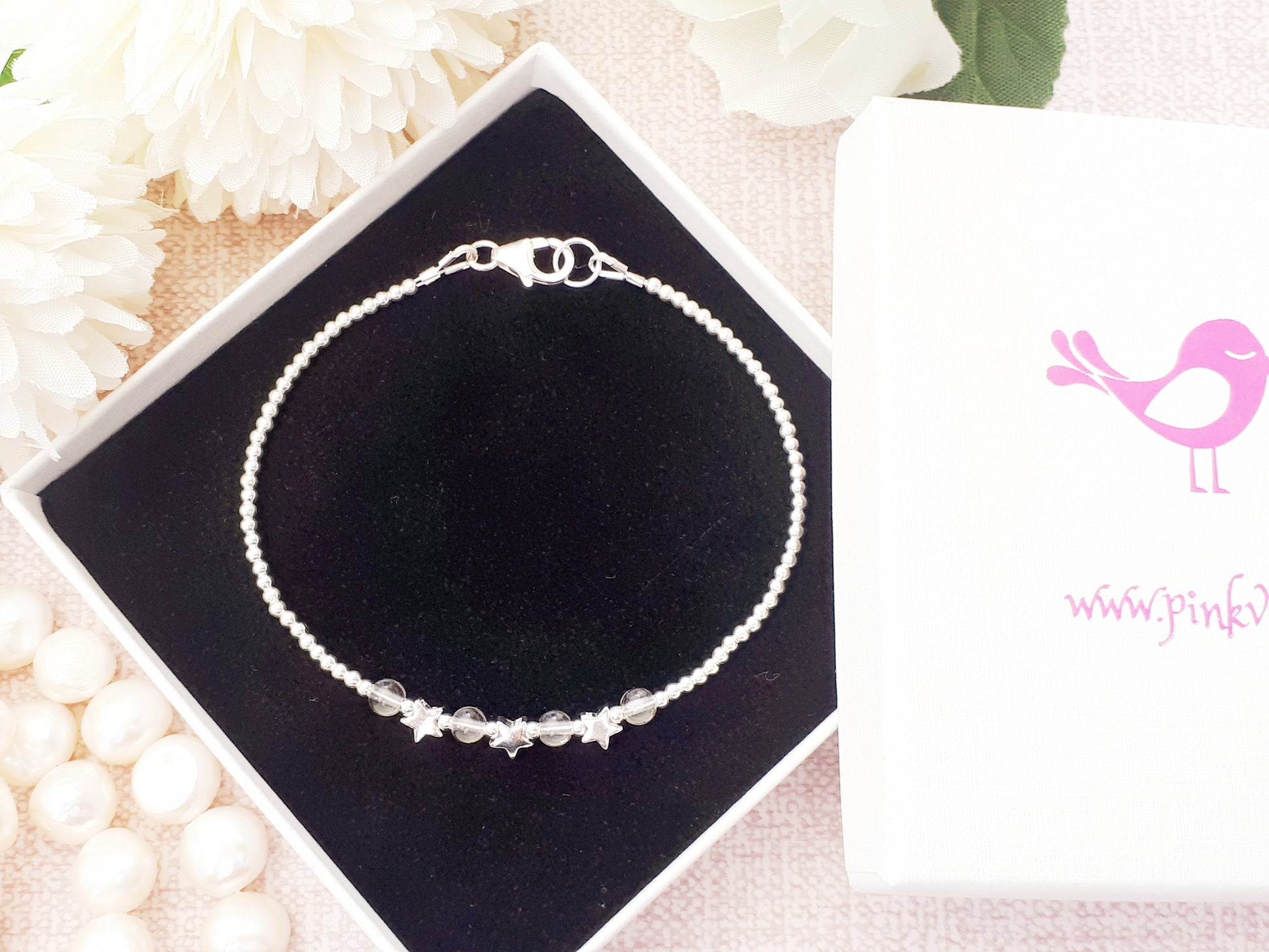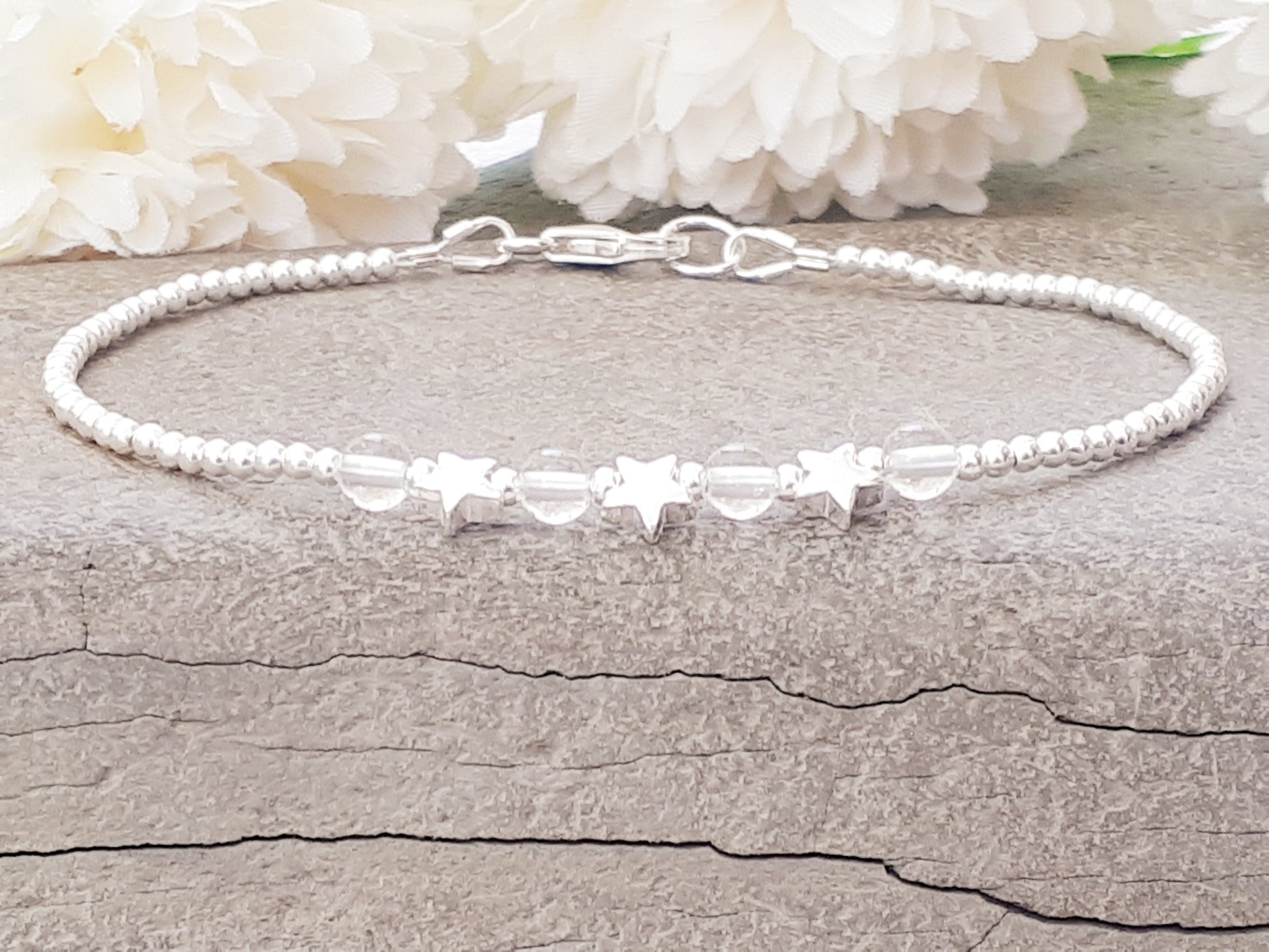 This April birthstone star bracelet is made with sterling silver stars, beads, and crystal quartz gemstones. The perfect gift for someone special, it combines elegance with a touch of sparkle. Show them how much you care with this unique and beautifully handcrafted bracelet. This bracelet can be personalised with any initial, number or zodiac sign onto a sterling silver heart charm.