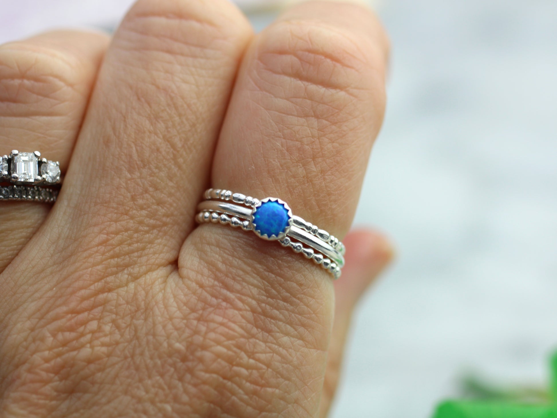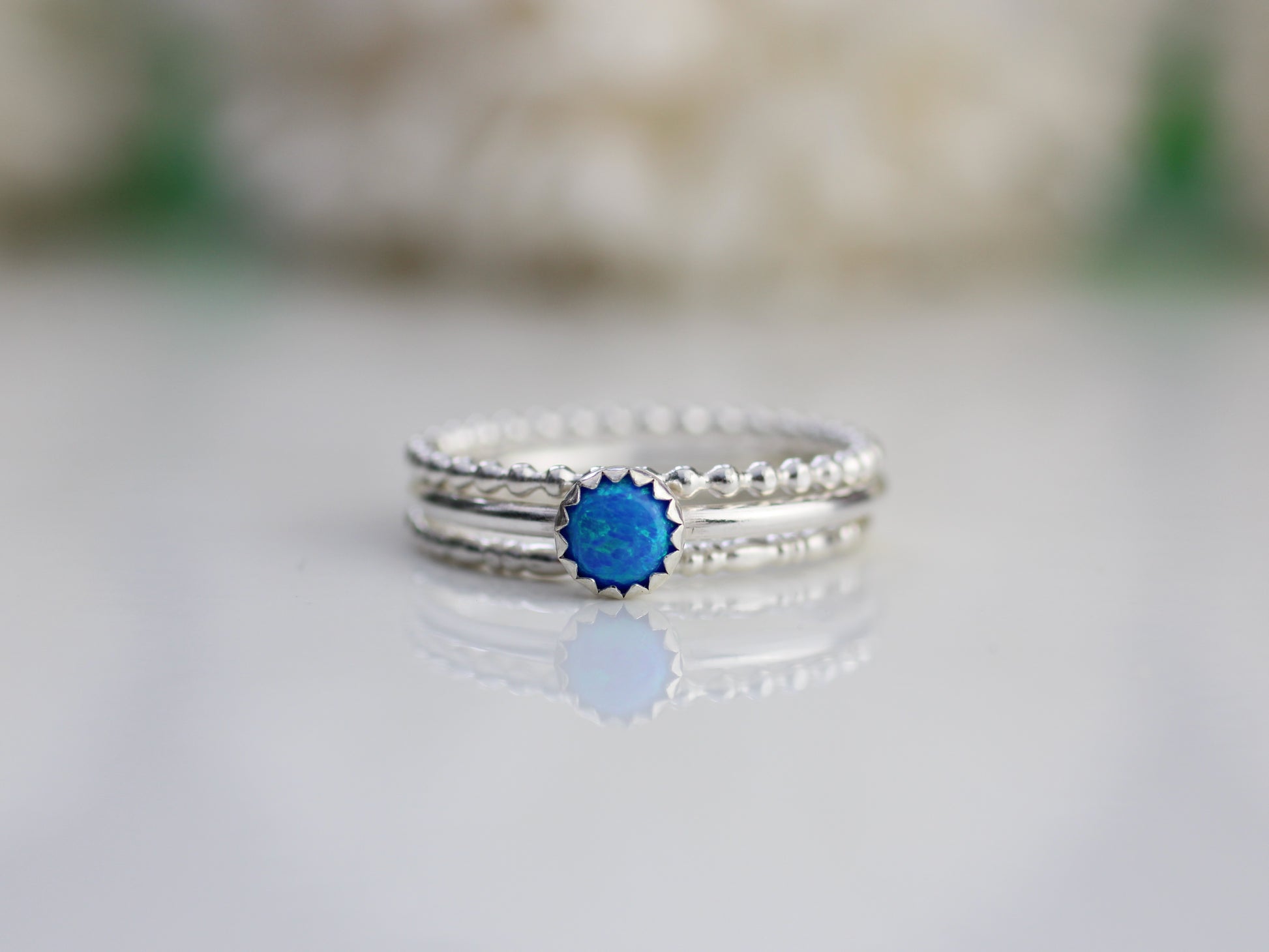 This stunning opal stacking ring set features a manmade gemstone as the centrepiece. The set includes three sterling silver rings, each with a unique design. The gemstone is elegantly set in a crown setting.