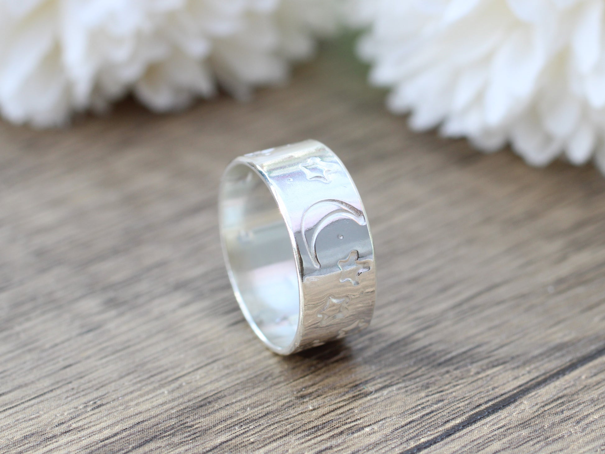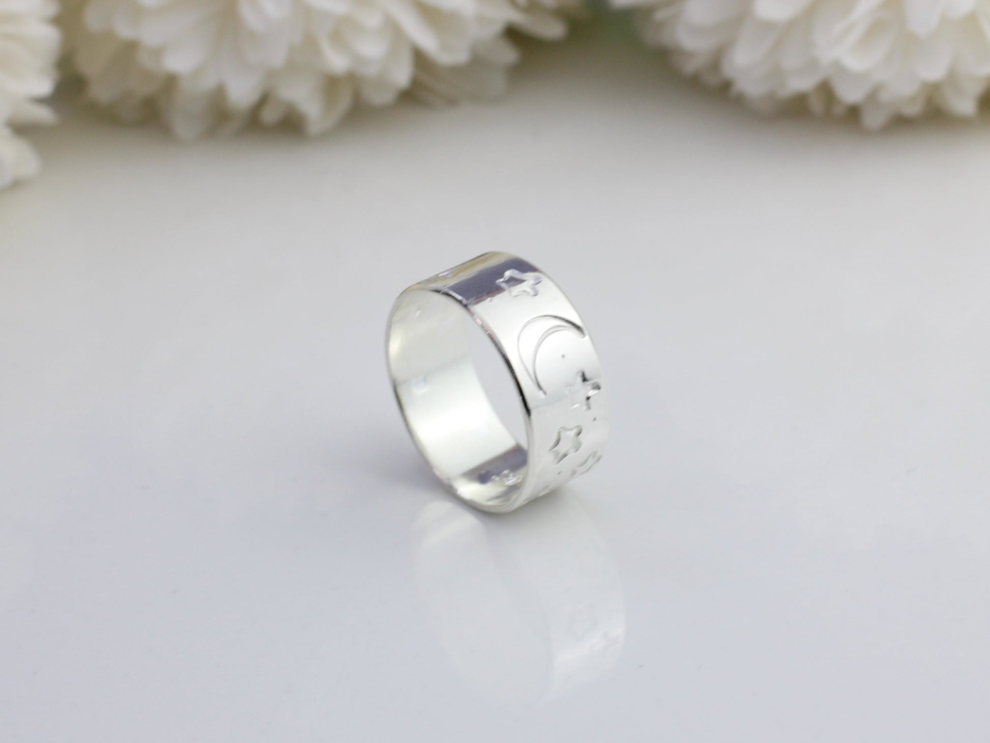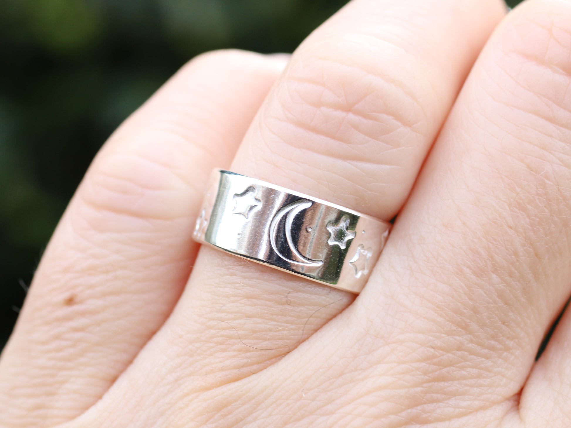 Elevate your style with our celestial ring. Hand-stamped with a celestial pattern, this sterling silver band is crafted from recycled metal and available in size Q1/2 8.5 USA. This is a ready-to-ship item. No refunds and or resizing available.