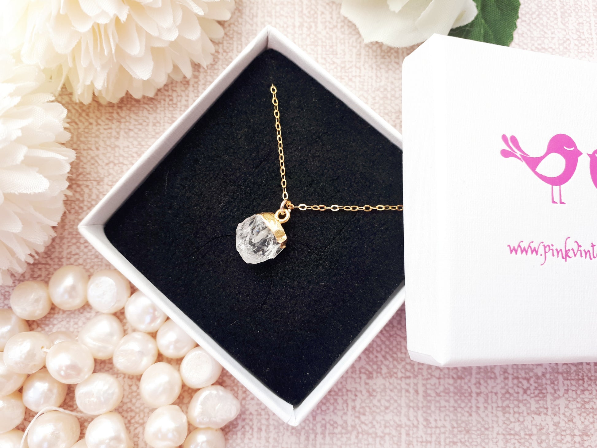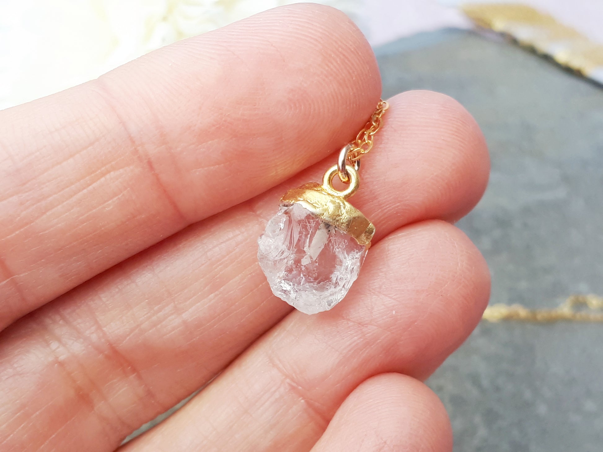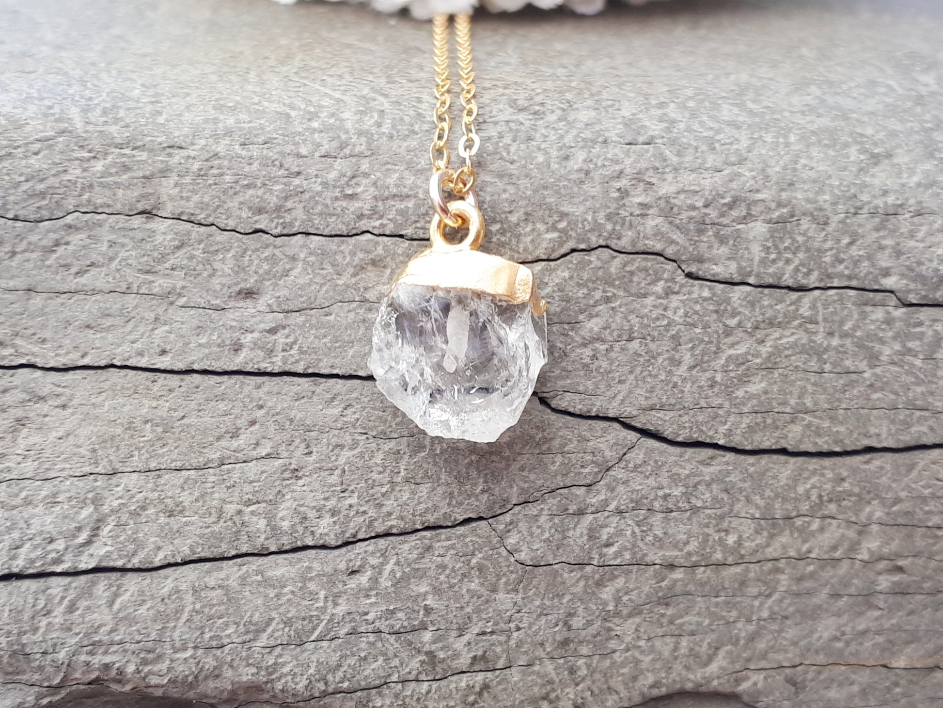 Clear quartz necklace in gold. April birthstone.