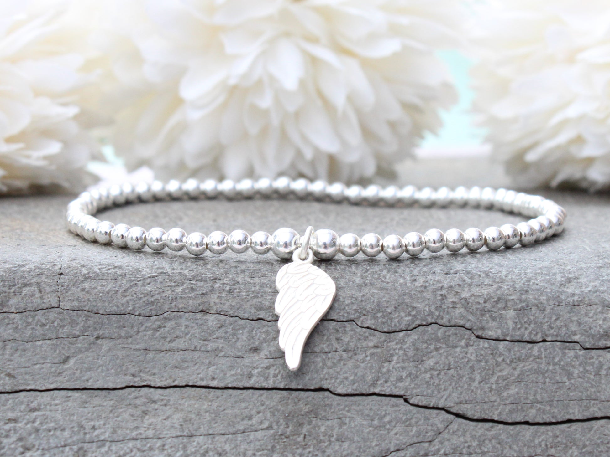 A sterling silver angel wing charm surrounded by sterling silver beads.