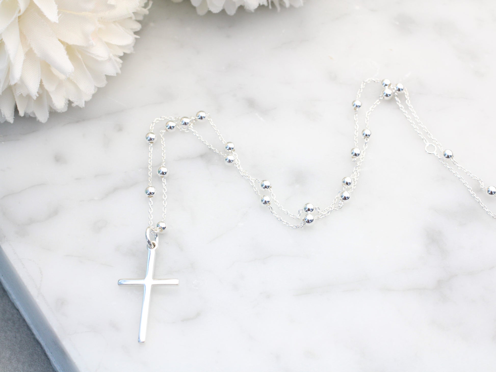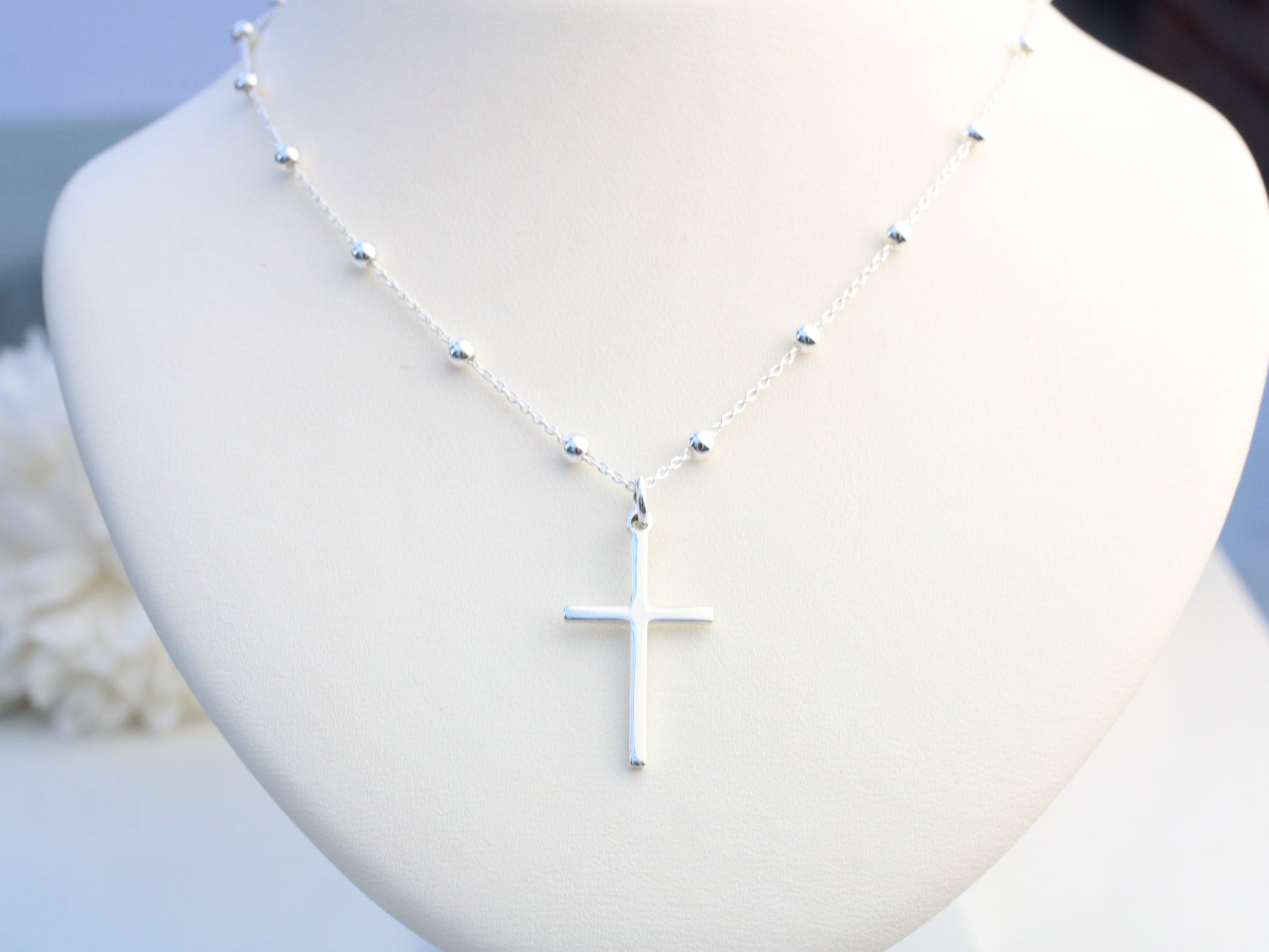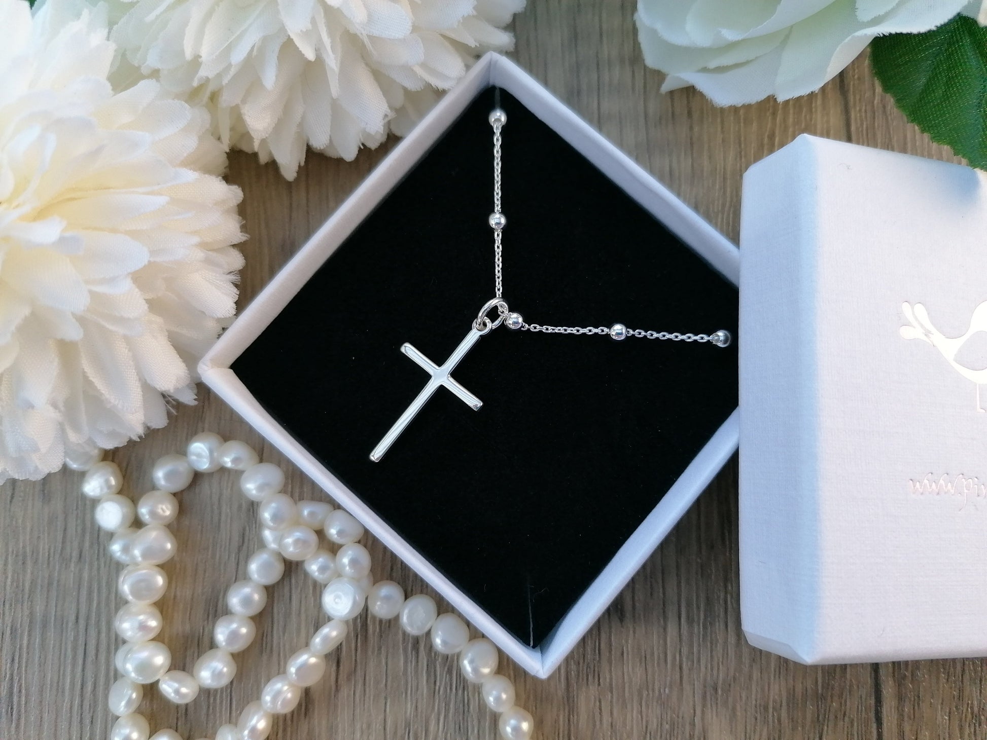 Elevate your style and showcase your faith with our stunning cross necklace in sterling silver. Crafted with a sterling silver cross and satellite chain, it offers a versatile length of 16 to 18 inches. Personalise it with an initial to make it uniquely yours.