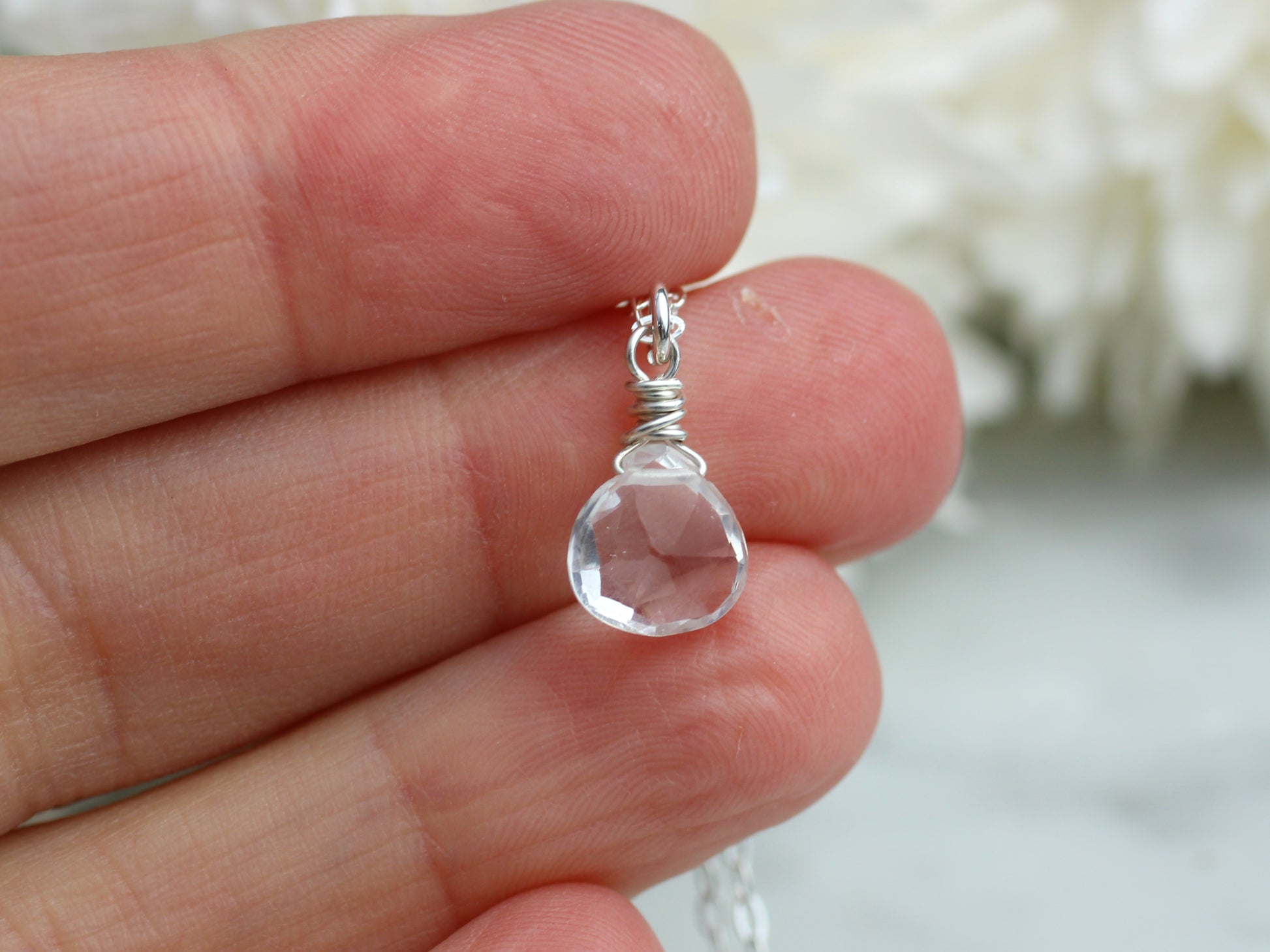 Embrace your inner beauty with our stunning clear quartz necklace. Featuring a gorgeous natural quartz briolette gemstone, wire-wrapped in sterling silver.