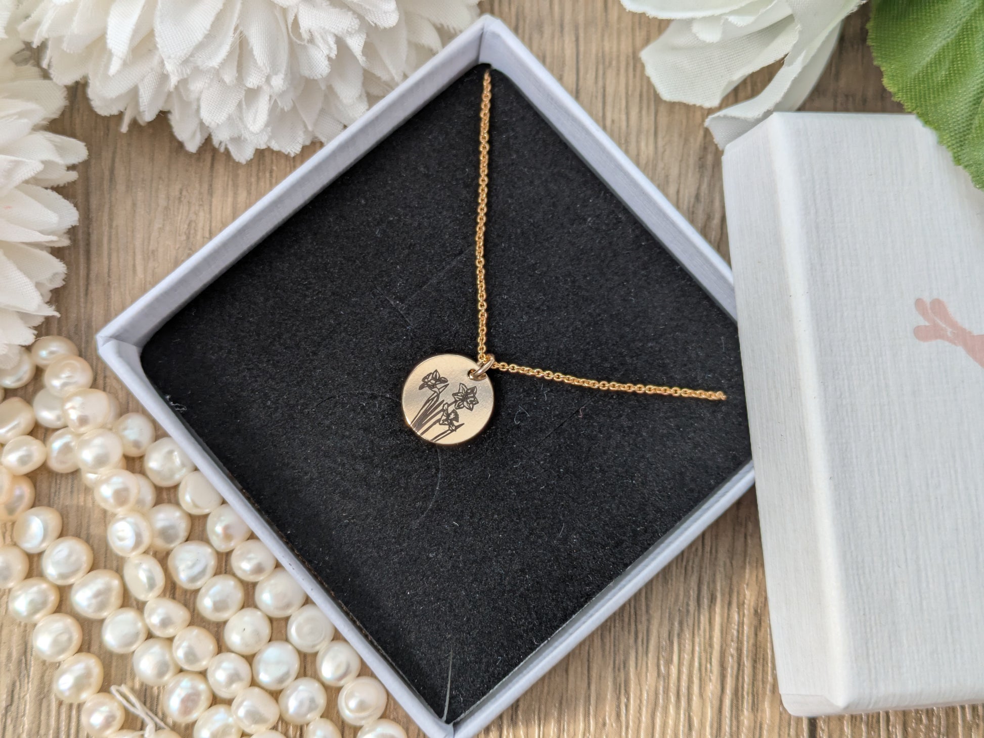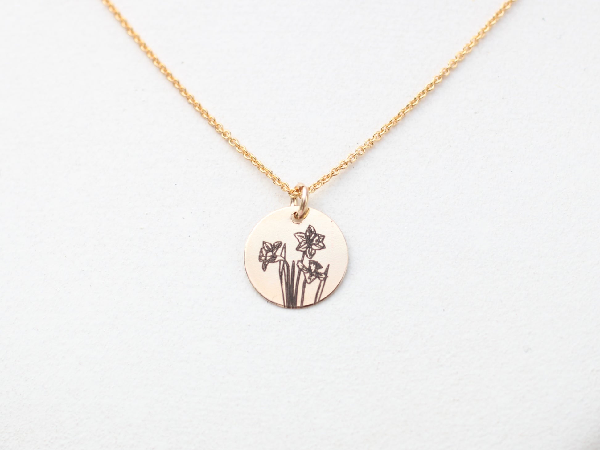 Add a touch of whimsy to your outfit with our Daffodil necklace. The engraved flower on the 11mm disc comes in gold-filled or silver, and you can even add a pop of colour with a yellow charm. Perfect for a playful and unique look!