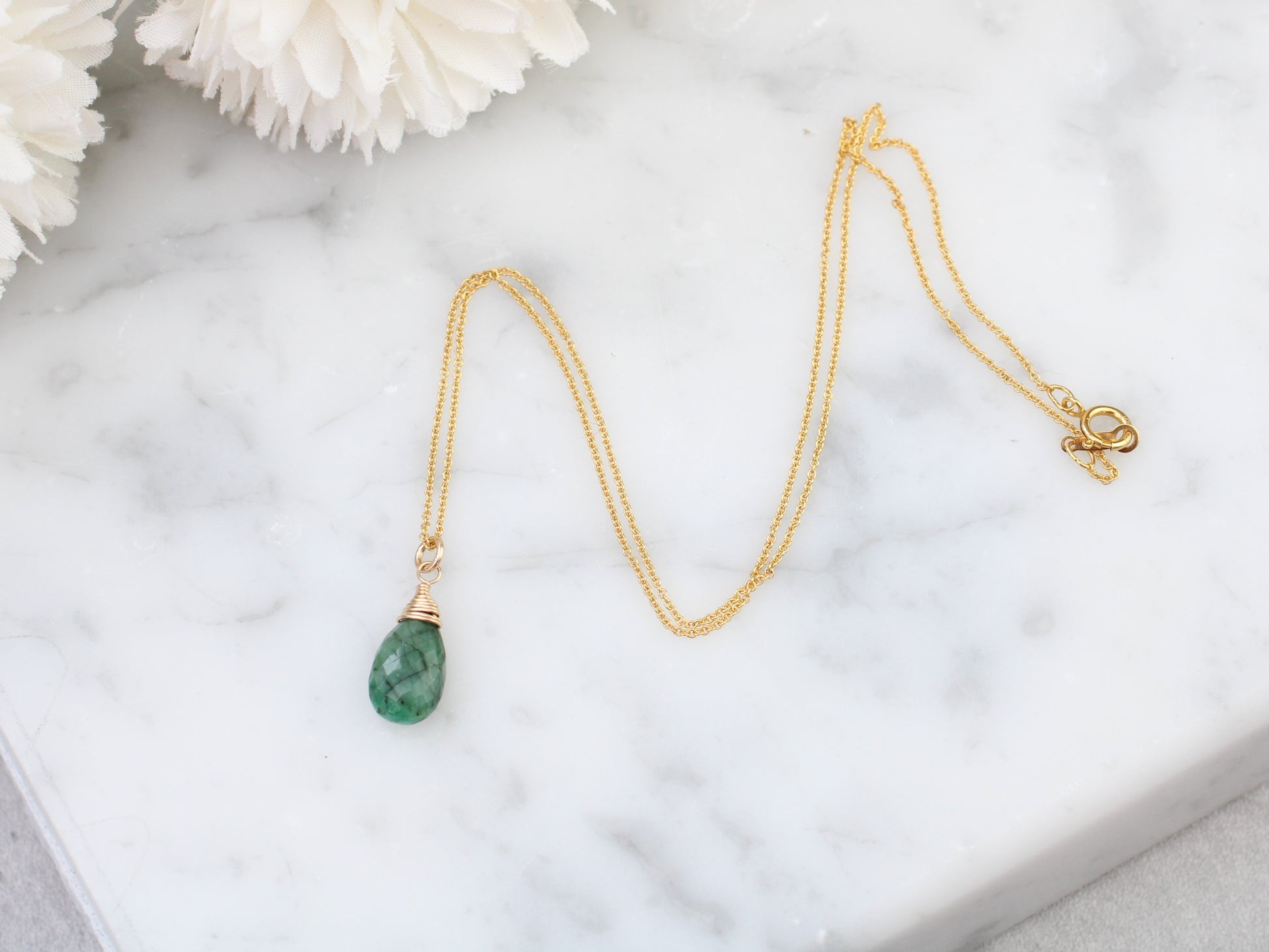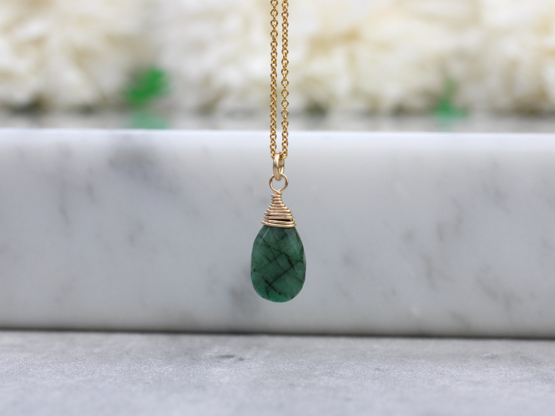 Treat yourself or a loved one to this stunning emerald necklace, available in silver or gold. Featuring a natural emerald briolette gemstone, wire wrapped in sterling silver or gold-filled metal. This elegant piece makes the perfect birthstone necklace for those born in May.