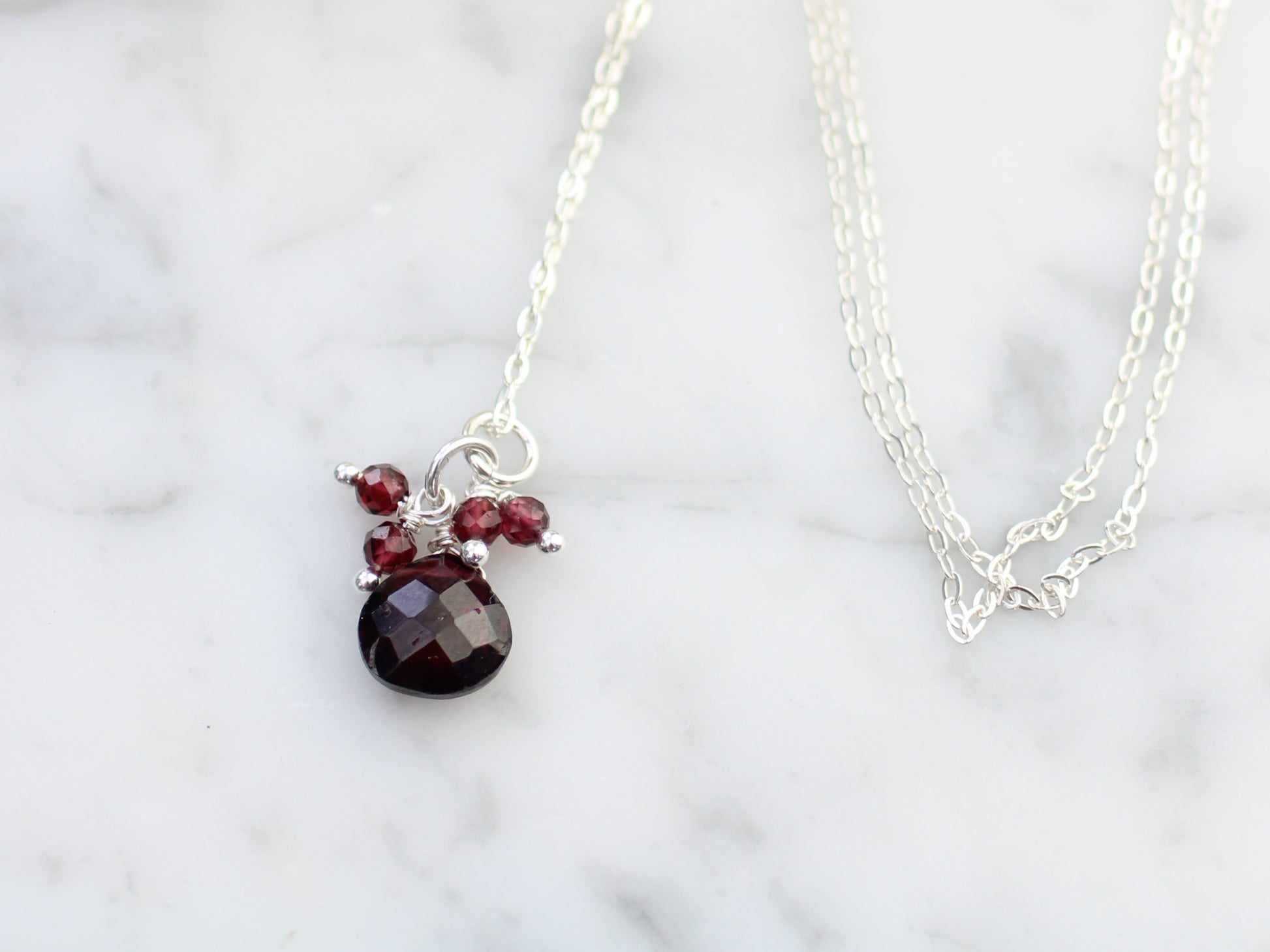 Treat yourself or someone special to this beautiful handmade garnet cluster pendant, crafted with care and attention to detail. A gorgeous garnet briolette takes centre stage, lovingly wire-wrapped in sterling silver and surrounded by sparkling faceted 3.5mm garnet beads that dance with light. As January's birthstone, garnet is believed to bring protection and positive energy to those born this month—making this pendant a meaningful choice for a birthday gift or personal keepsake. Each piece is handmade, so you're wearing a unique creation that celebrates both artistry and natural beauty. Perfect for adding a touch of warmth and elegance to your everyday style.