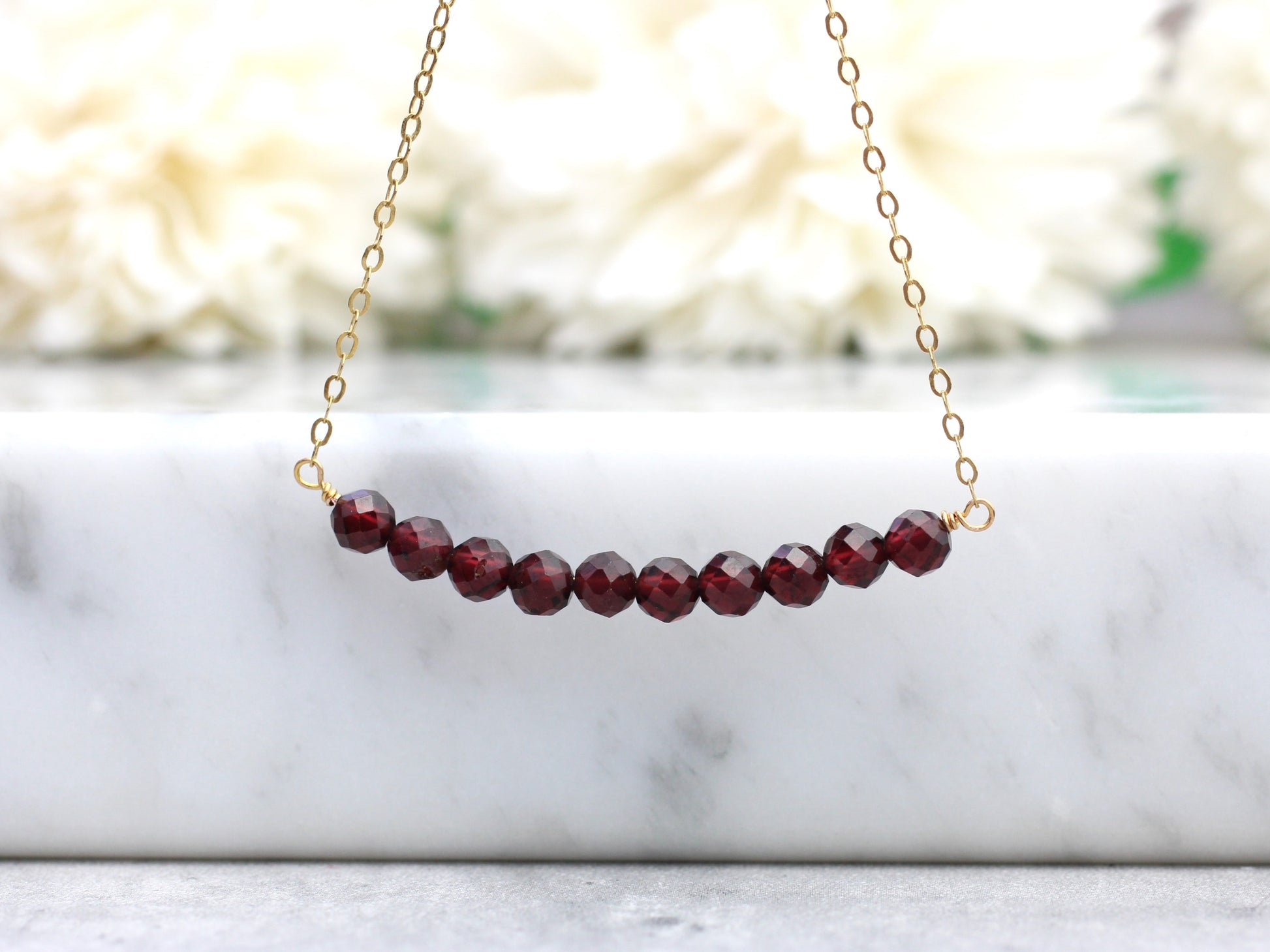 This January birthstone necklace features genuine garnet gemstone beads and is available in either sterling silver or gold.