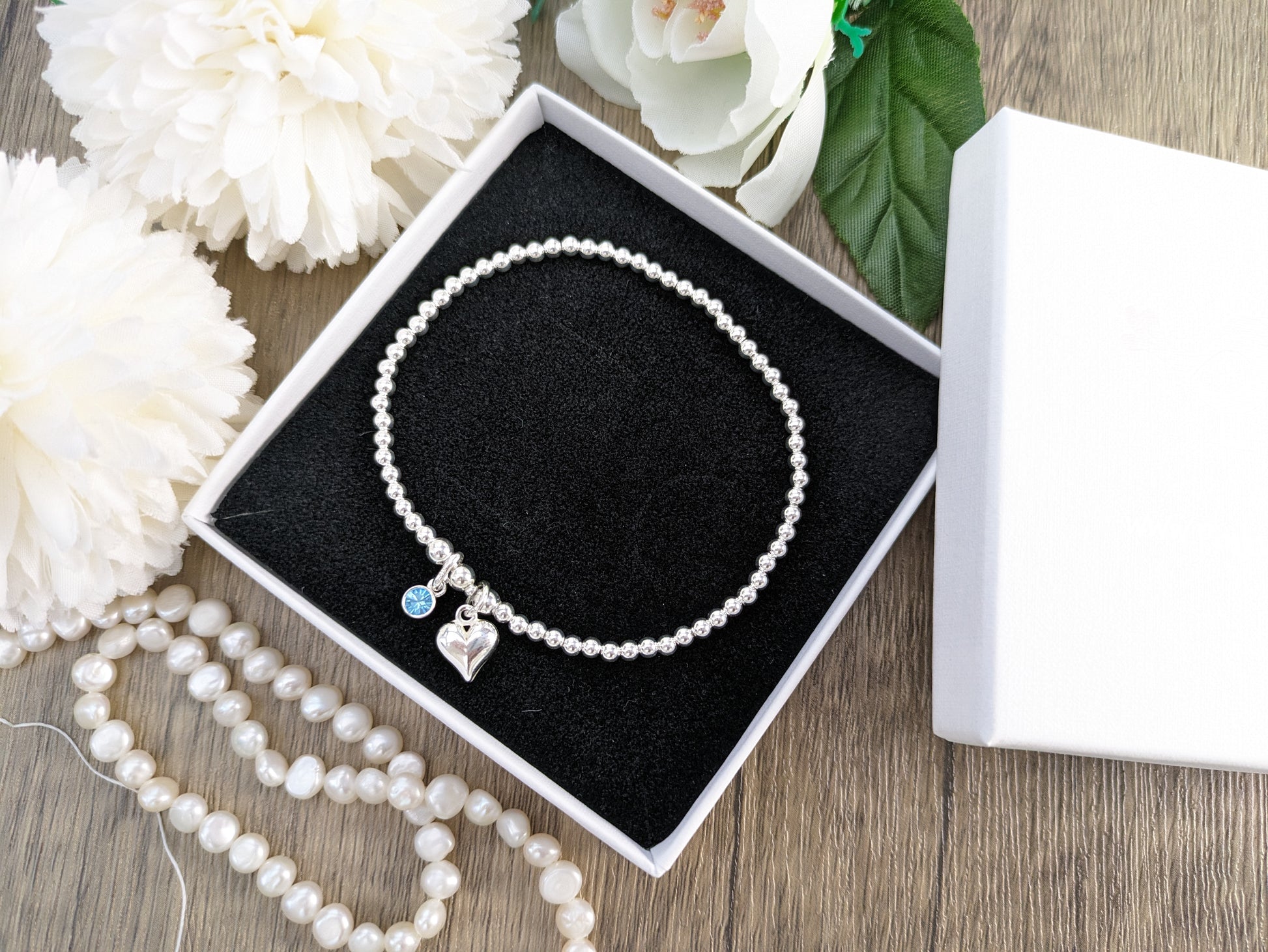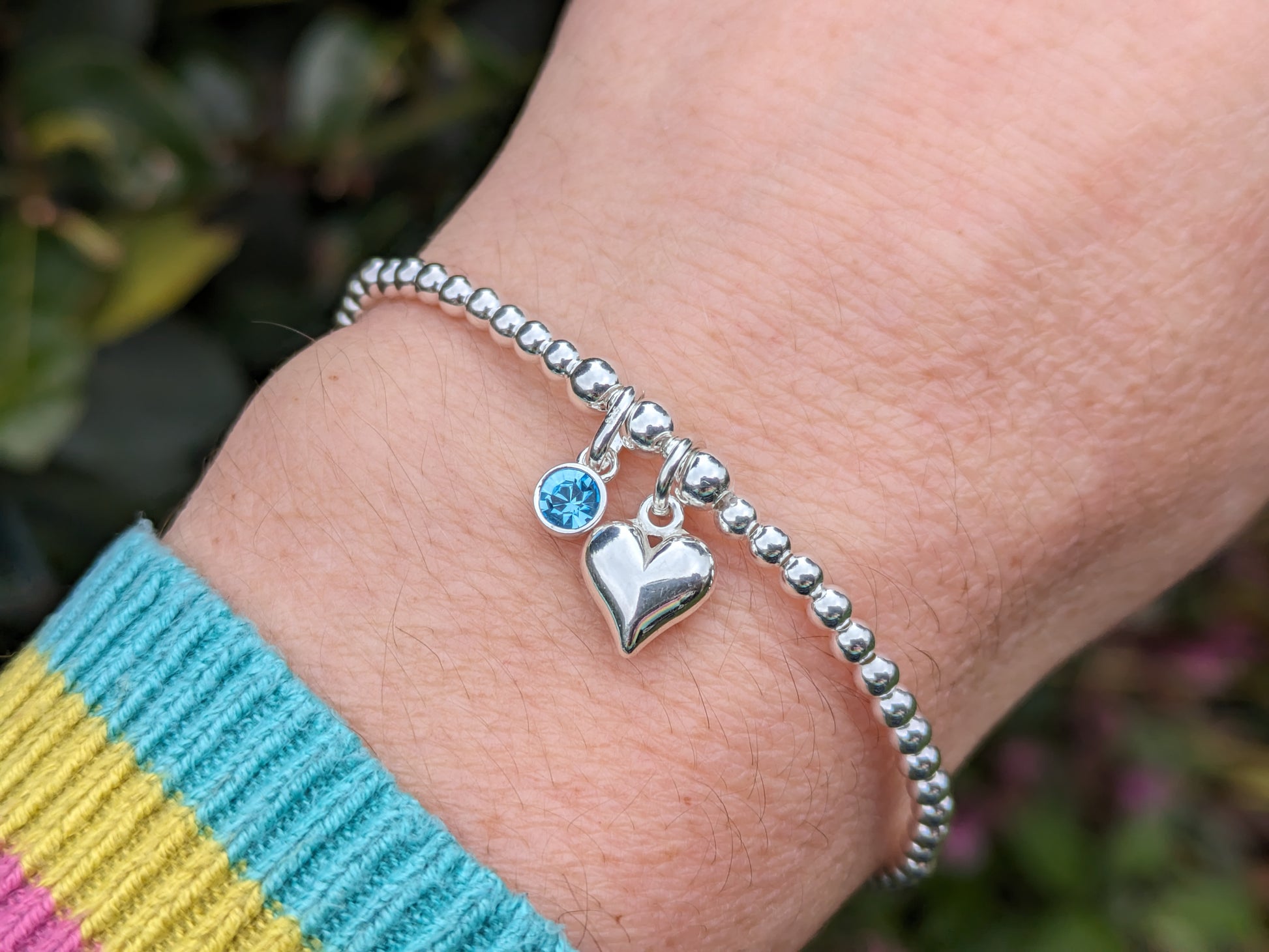 Are you looking for a unique and meaningful gift? Look no further than this beautiful sterling silver stretch bracelet with its heart charm and a Swarovski aquamarine charm—the perfect gift for someone special born in March. It's the perfect way to show your love and appreciation.