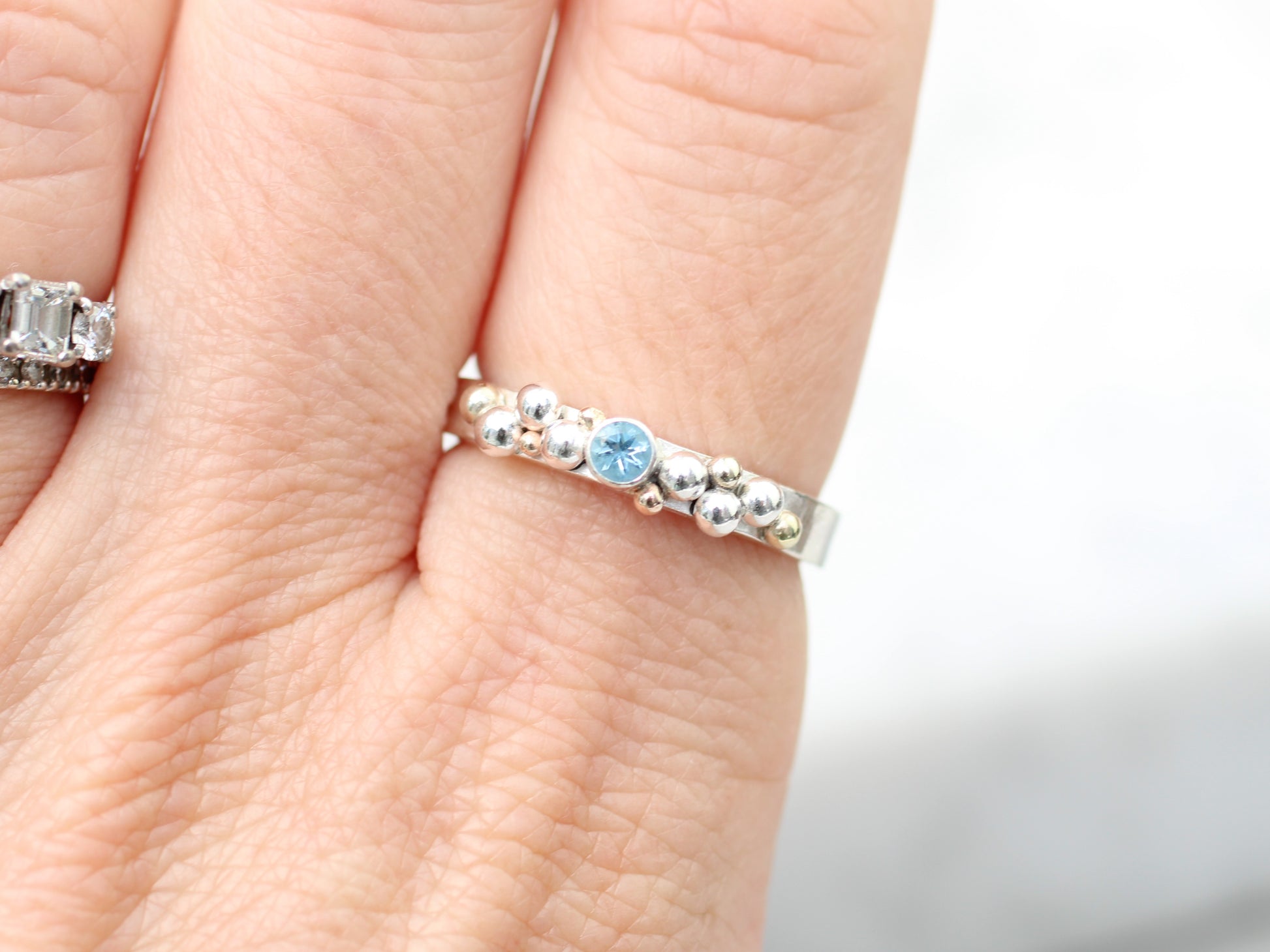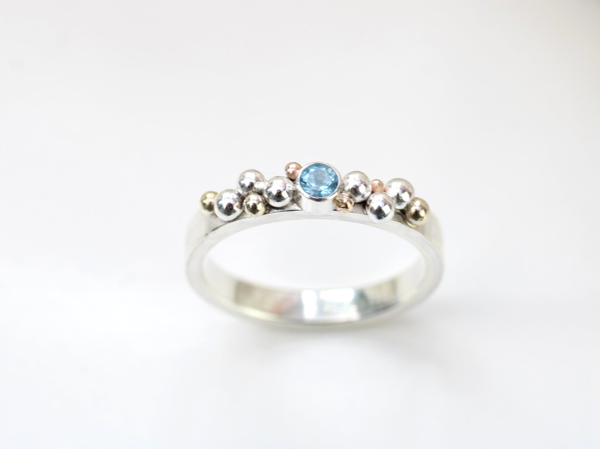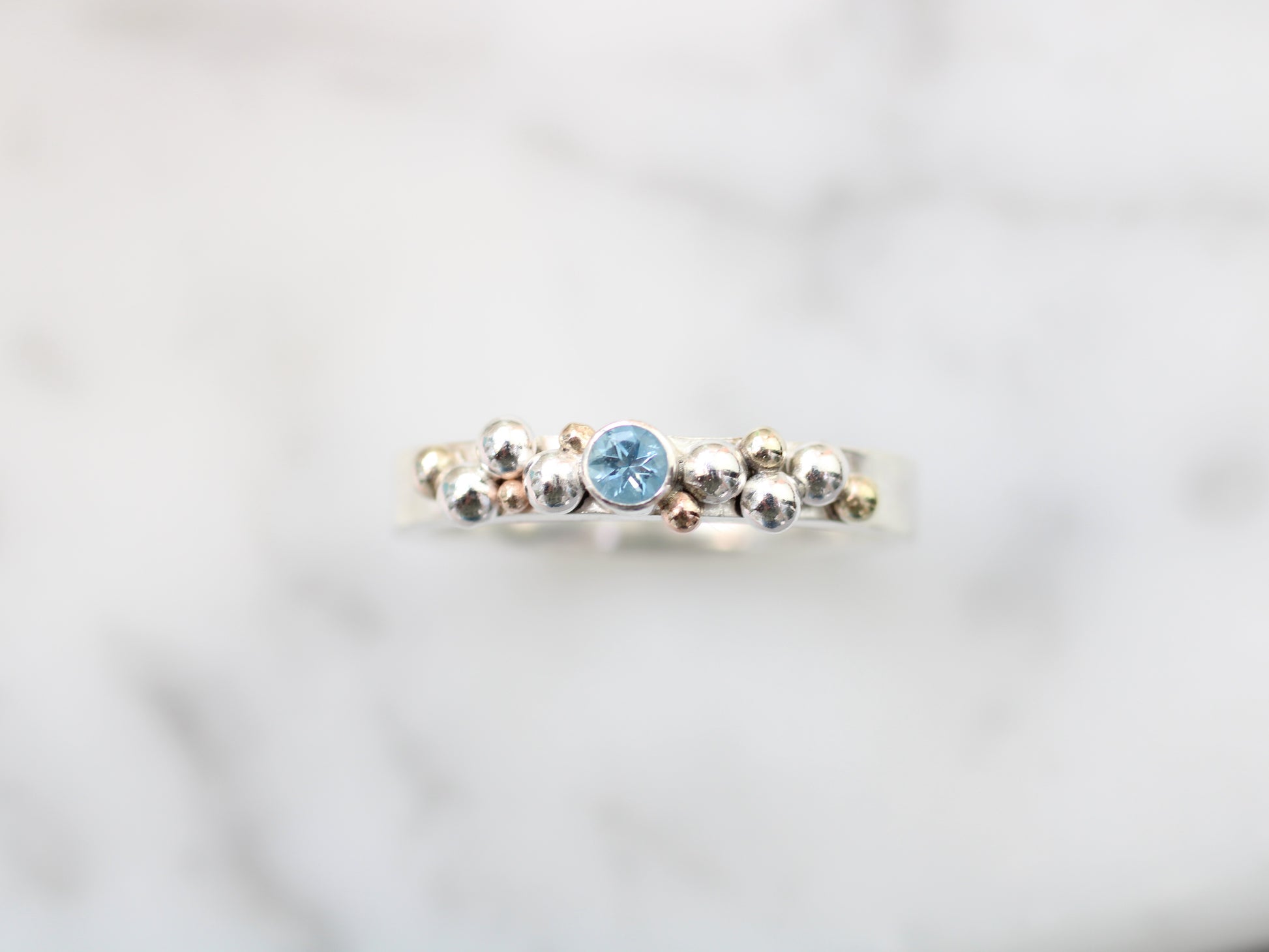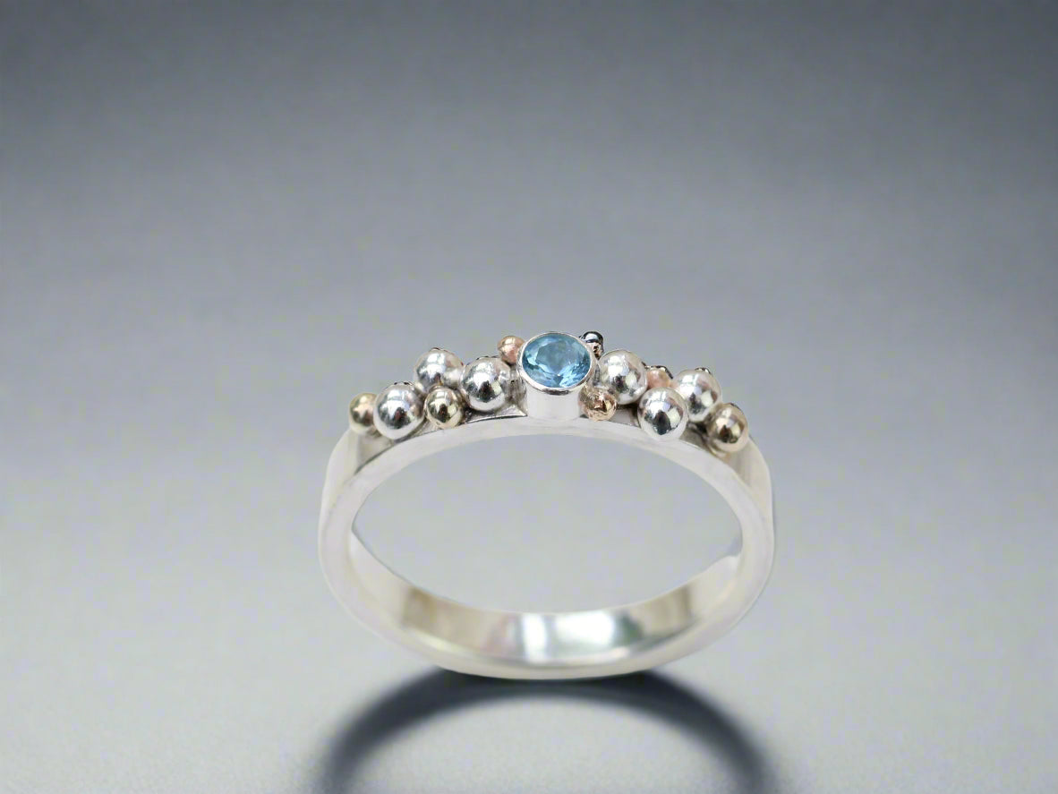 This enchanting ring is handmade to order in 1–2 weeks, bringing serious sea vibes to your fingers! Crafted with delicate silver and gold granulation, it features a sparkling 3mm gemstone of your choice — aquamarine, or any stone that speaks to you.