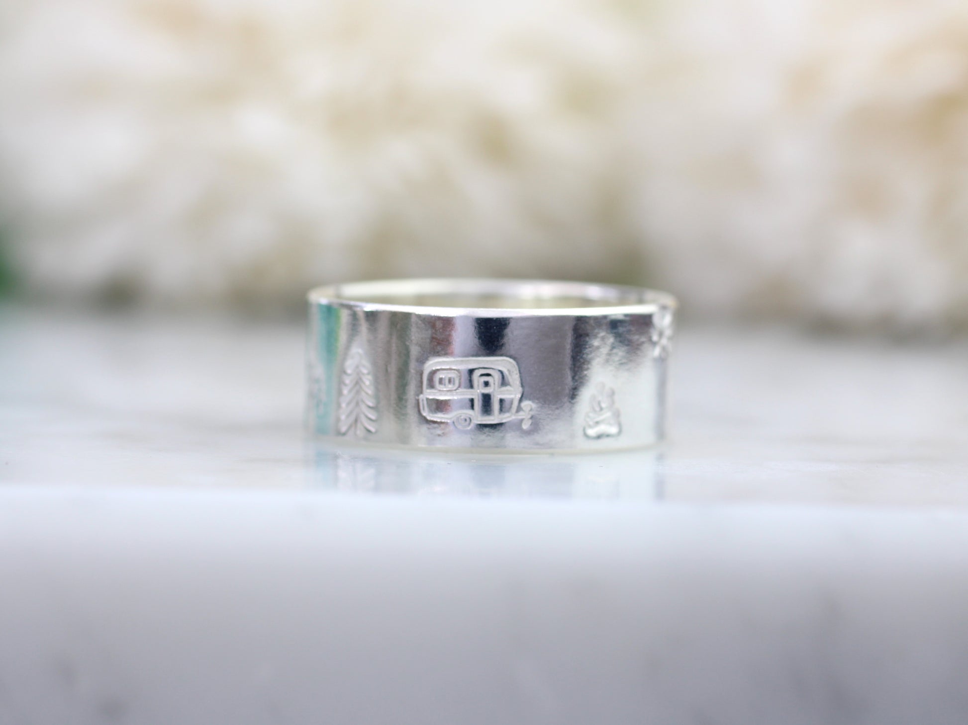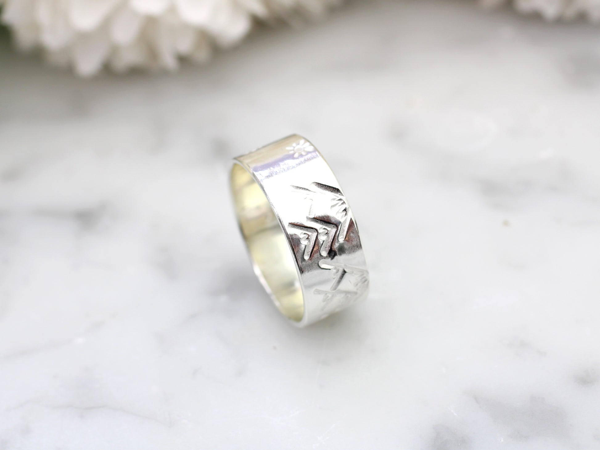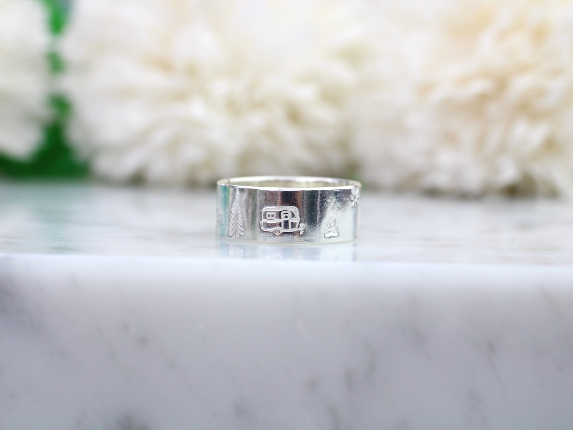 Embrace sustainability and style with our handcrafted mountain ring made from recycled sterling silver. With a hand-stamped unique design of a caravan, mountains, and trees, this ring is a nod to your love for nature. Feel good about your purchase and make a statement with this eco-friendly piece.