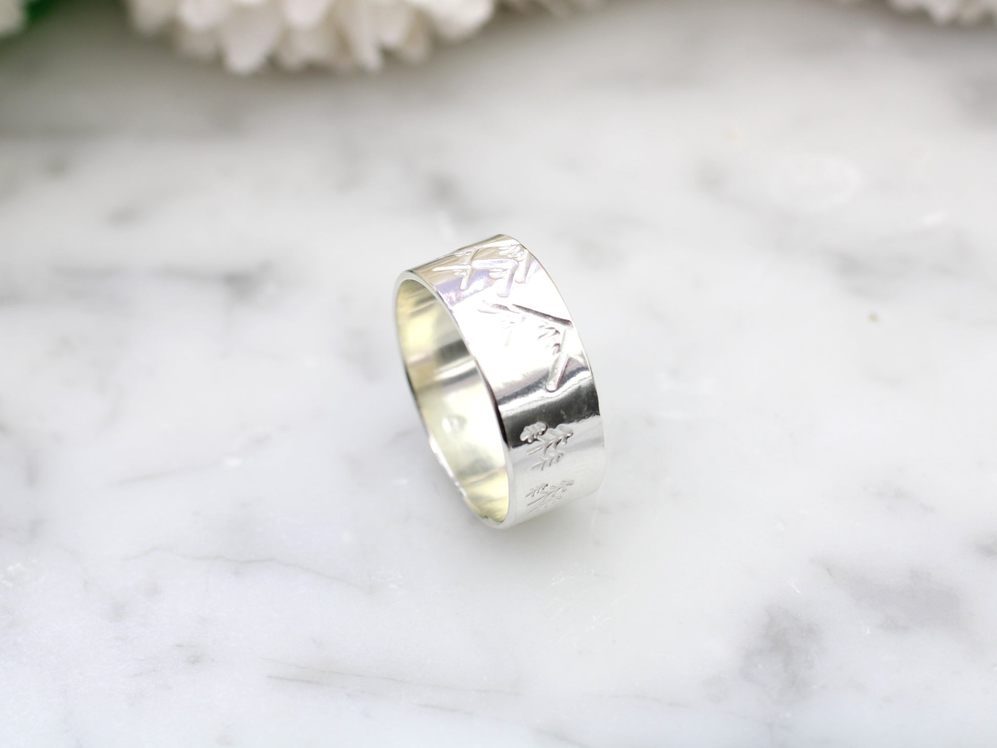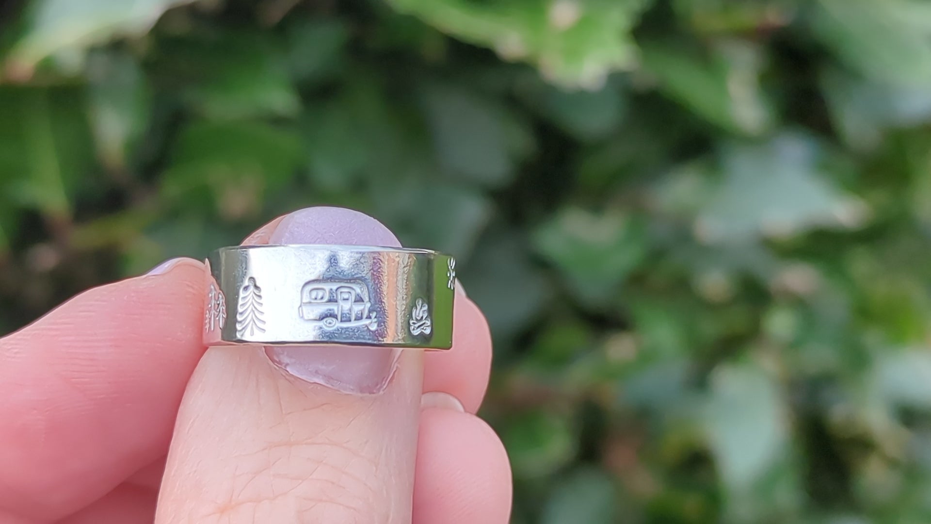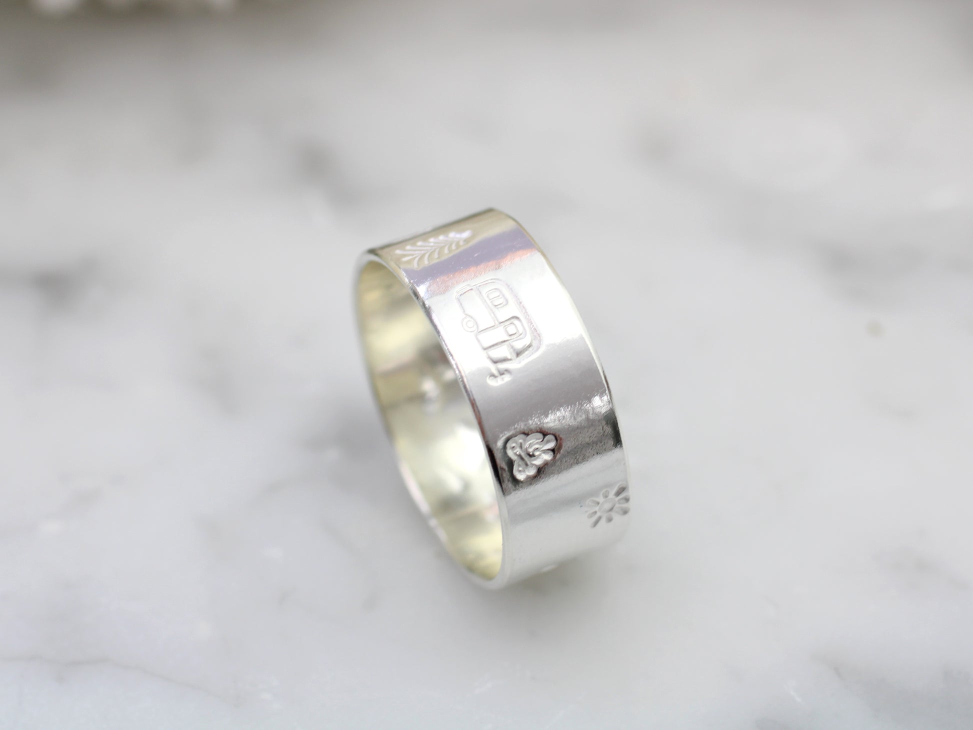 Embrace sustainability and style with our handcrafted mountain ring made from recycled sterling silver. With a hand-stamped unique design of a caravan, mountains, and trees, this ring is a nod to your love for nature. Feel good about your purchase and make a statement with this eco-friendly piece.