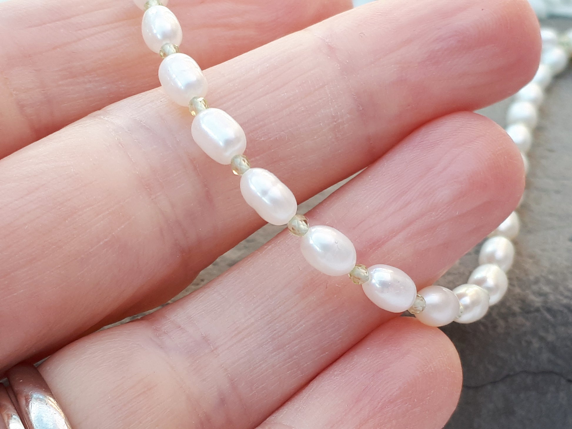 This beautiful handmade beaded necklace features lustrous freshwater pearls and sparkling peridot gemstones. The perfect accessory for any occasion, this necklace adds a touch of elegance and charm to any outfit. Each piece is lovingly crafted, making it a unique and special addition to your jewellery collection.