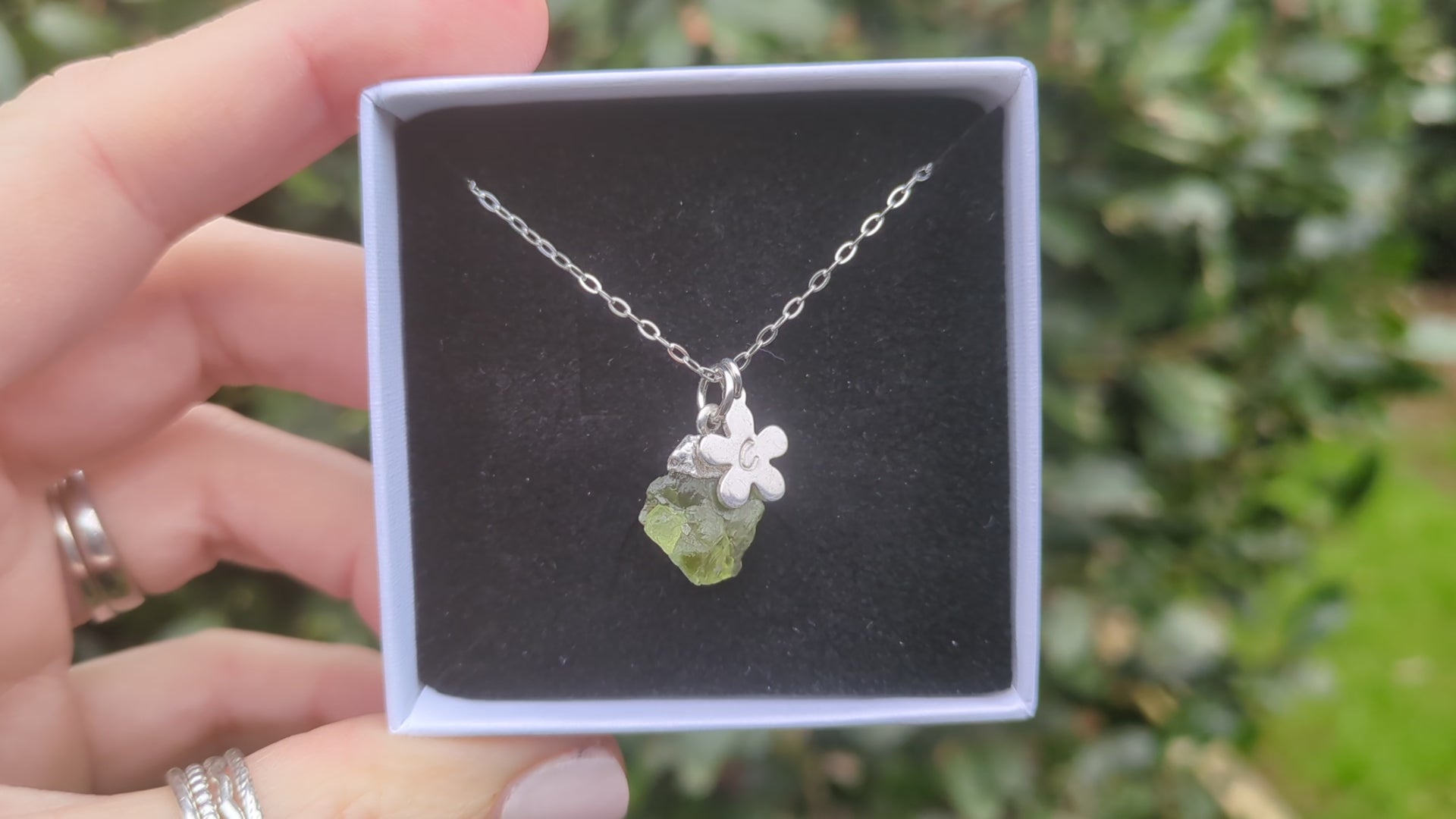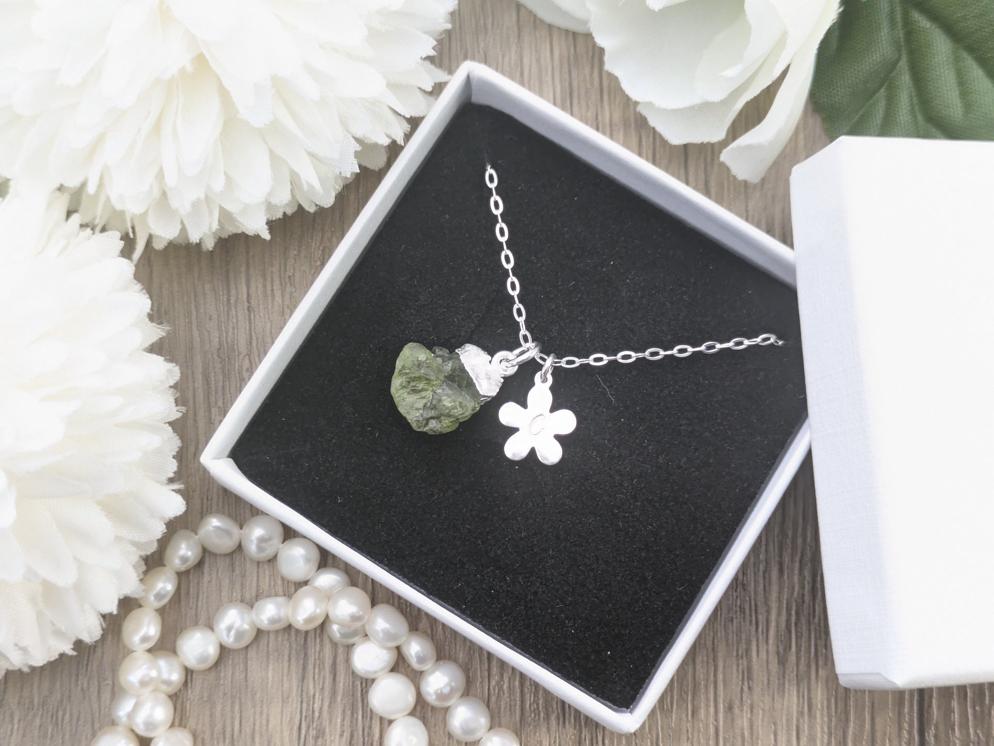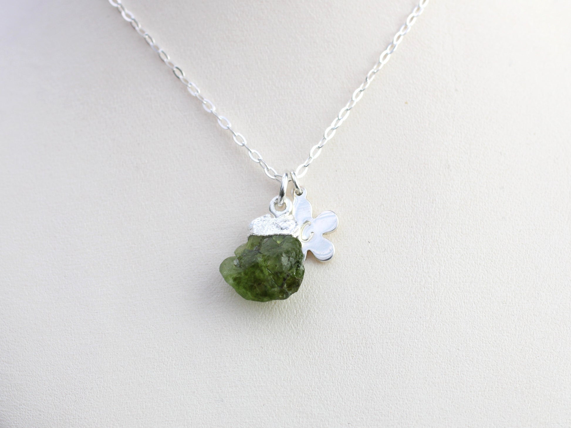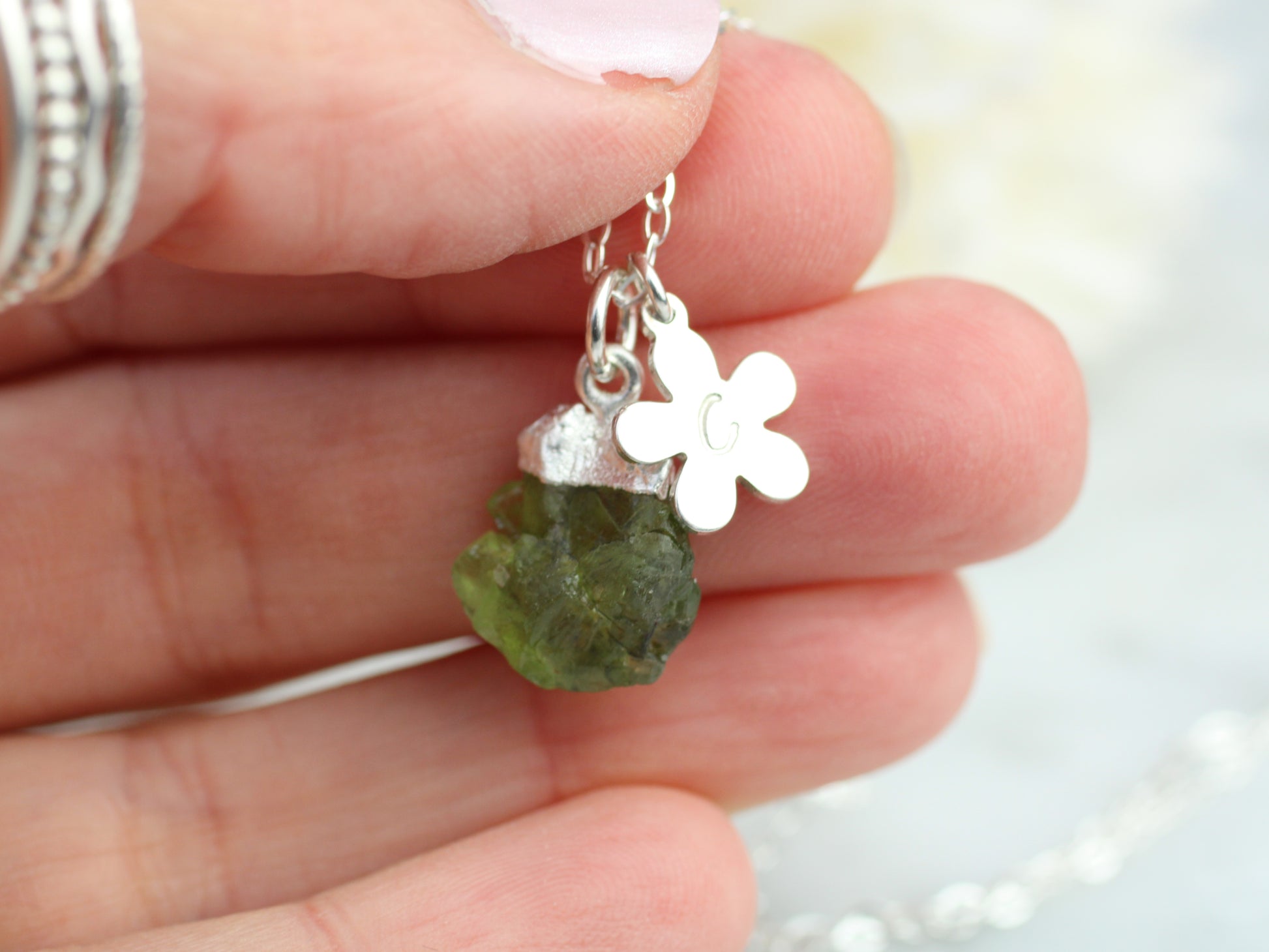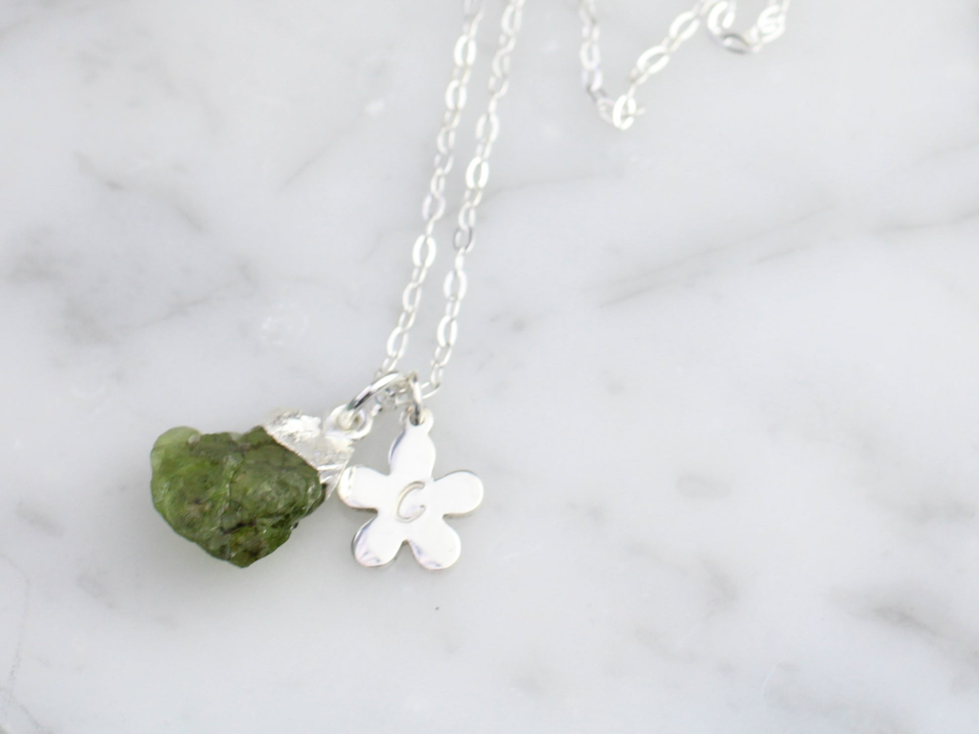 Elevate your style with our personalised peridot necklace in silver. Each necklace features a raw peridot gemstone on a delicate sterling silver chain, adorned with a charming flower charm. Make it your own by adding your initial for a unique touch. Experience the beauty and personalisation our necklace has to offer!