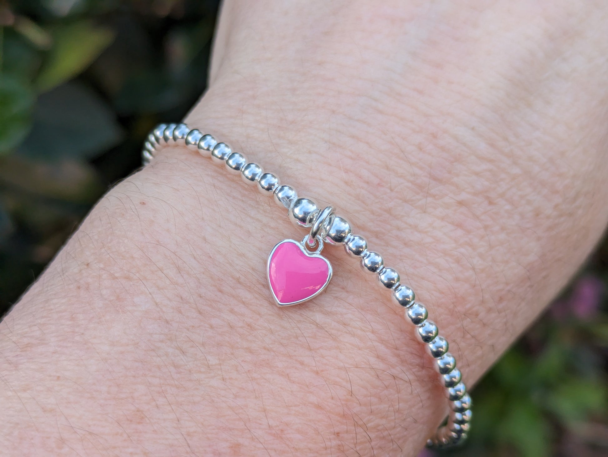 Treat the lady in your life with our Pink Heart Bracelet. Made with sterling silver beads and a gorgeous pink heart enamel charm, this bracelet is perfect for any special occasion.