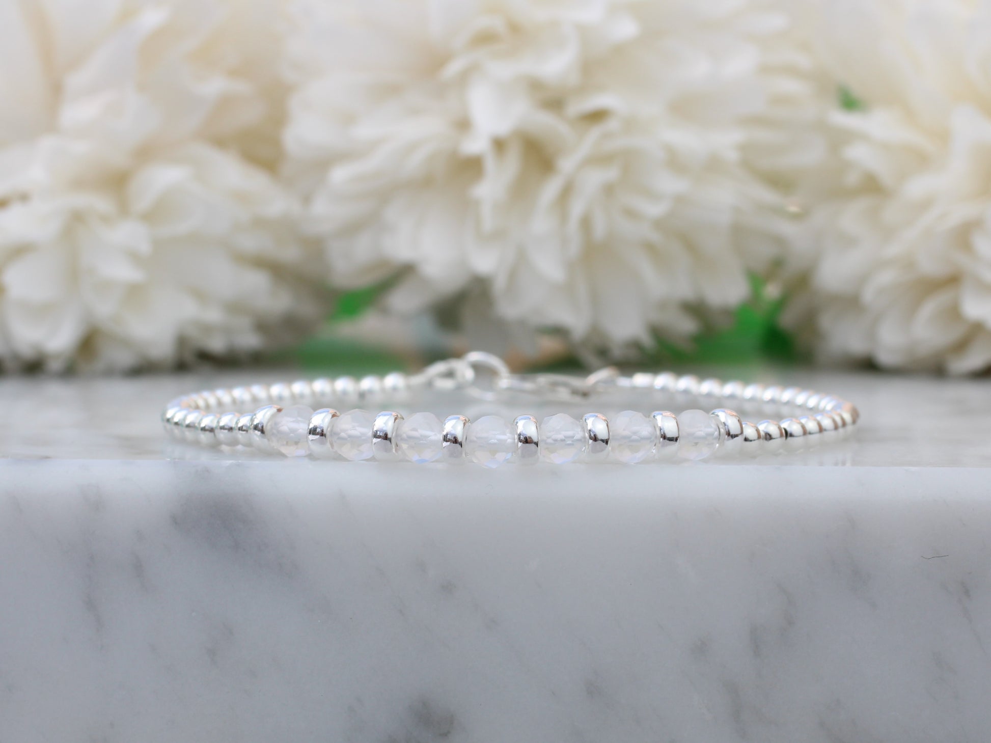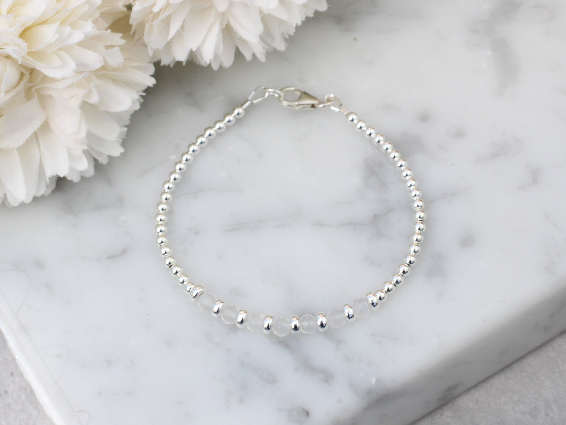 This beautiful silver bracelet features sparkling quartz gemstones and sterling silver beads, making it the perfect accessory for any outfit. As the birthstone for April, it also makes a thoughtful and meaningful gift for an April birthday. This bracelet can be personalised with any initial, number or zodiac sign of your choice onto a sterling silver heart charm.
