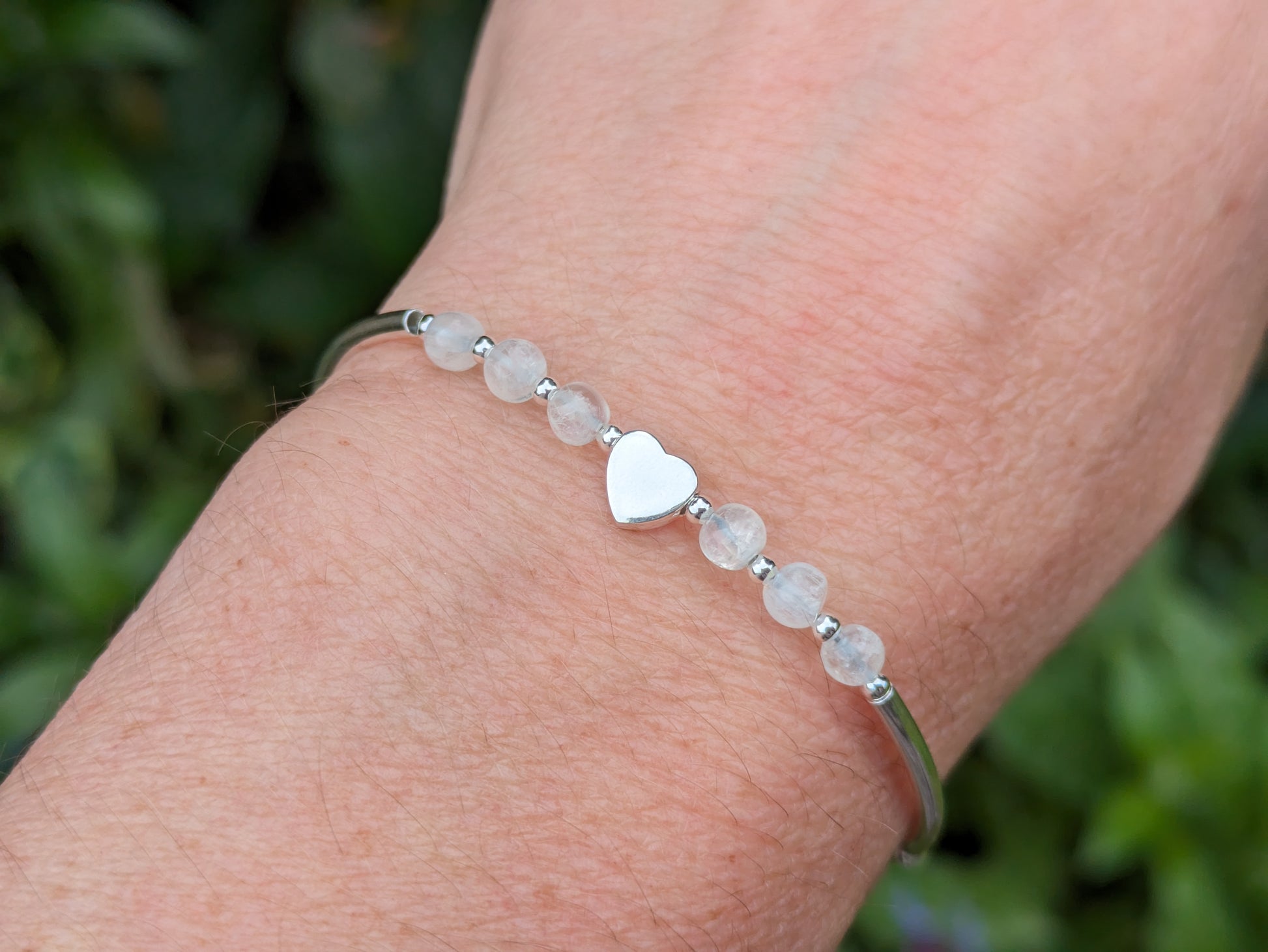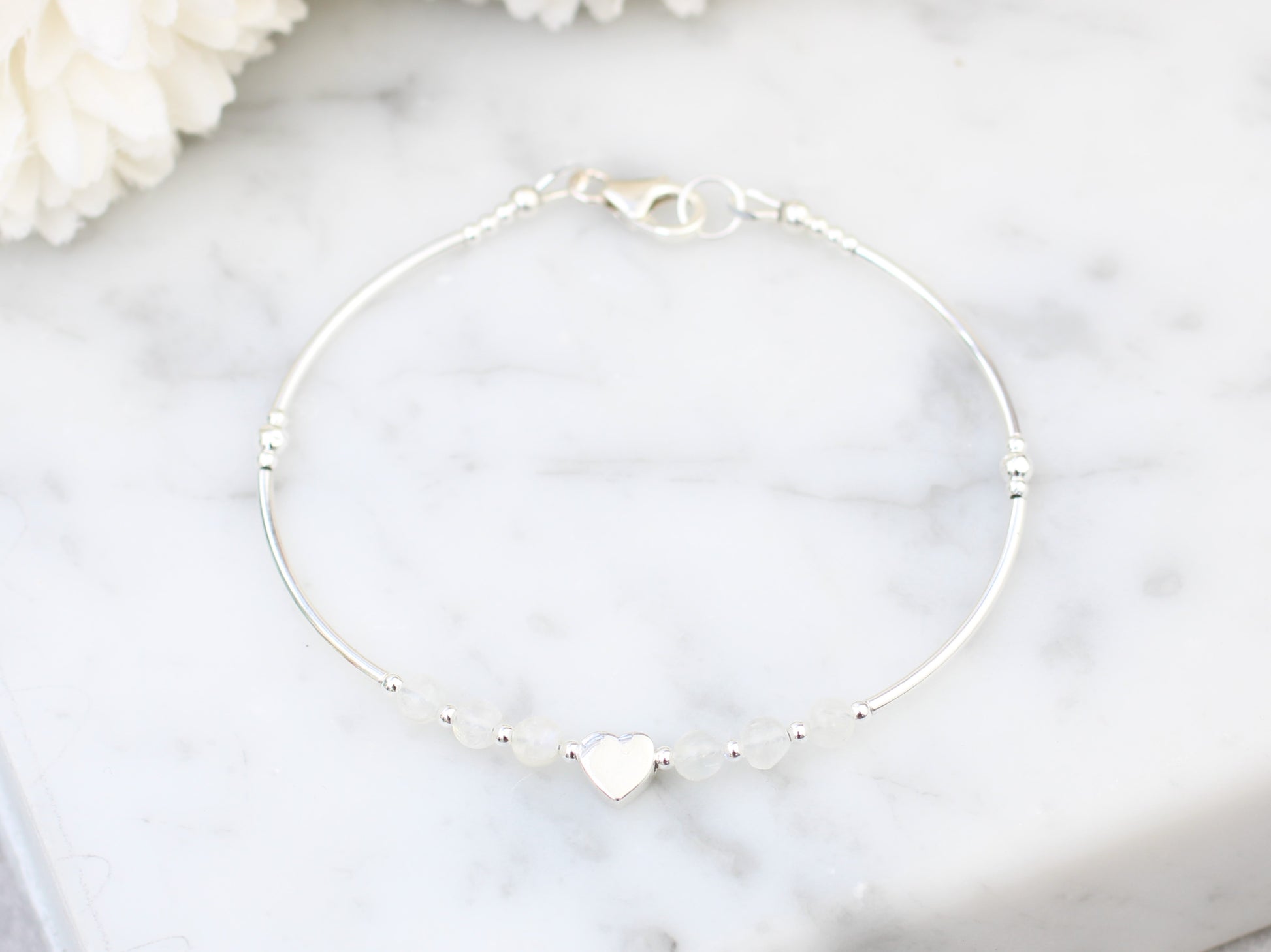 Embrace positive energy with our Rainbow Moonstone Bracelet! This bracelet is perfect for any June birthday gift, featuring stunning moonstone beads, sterling silver heart and noodle beads. Bring balance and harmony into your life with this beautiful accessory.