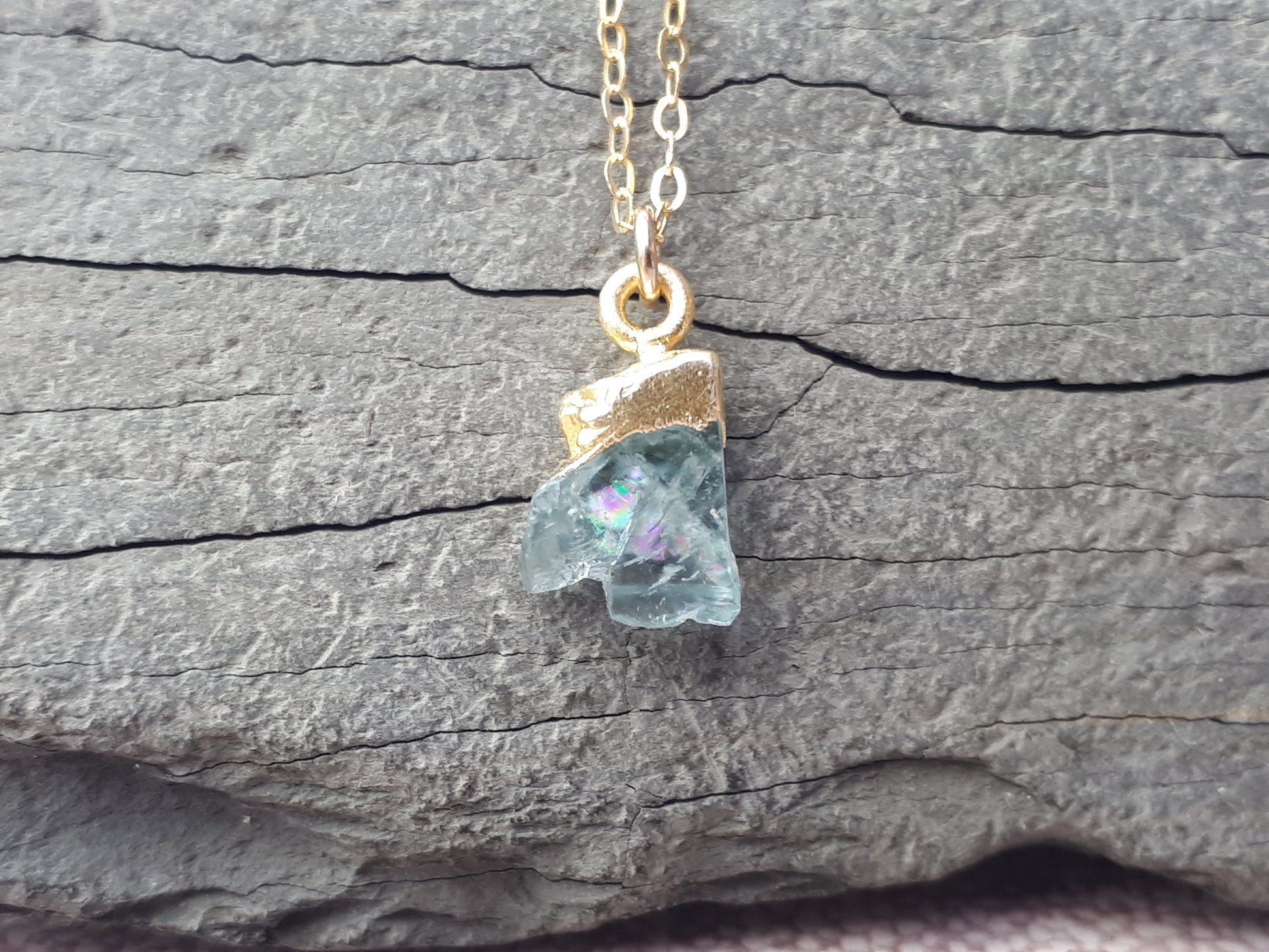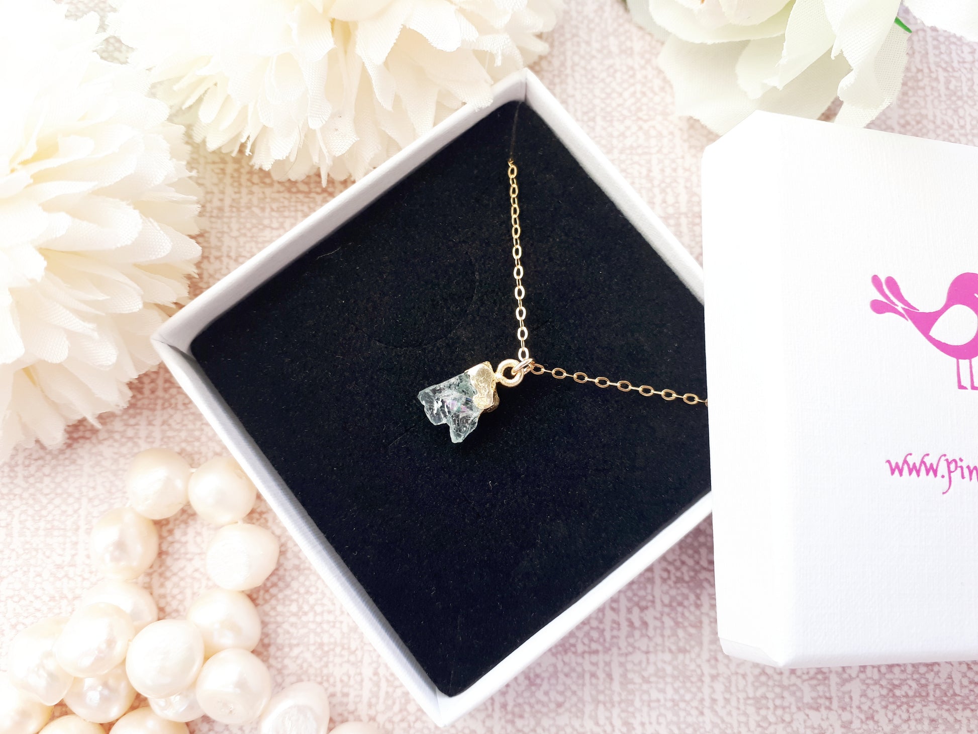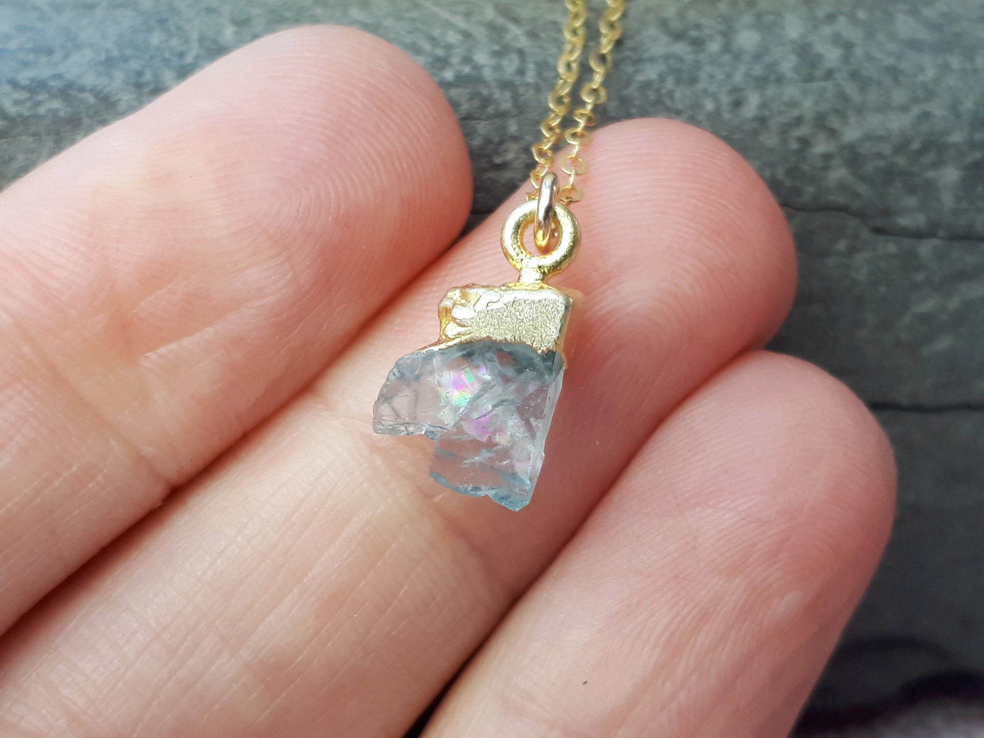 This stunning necklace features a raw aquamarine gemstone, perfect for those born in March. Plated in gold with a gold filled chain, it adds a touch of elegance to any outfit. Plus, the soothing energy of aquamarine is said to promote calm and balance. A beautiful and meaningful March birthday gift.
