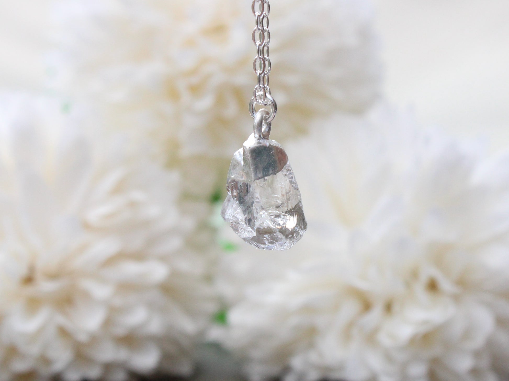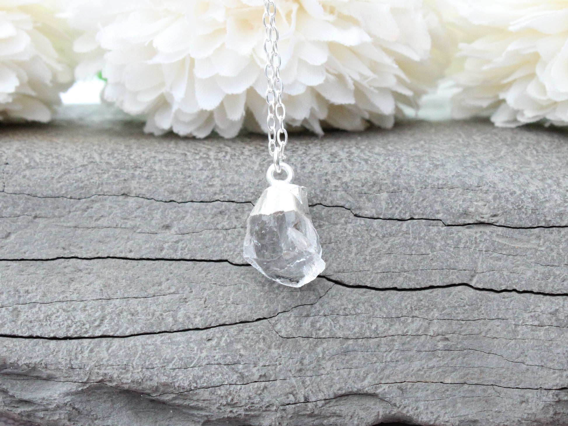 This beautiful necklace features a raw crystal quartz gemstone, known for its healing and cleansing properties. Crafted with sterling silver, it offers a sleek and elegant look. A perfect April birthstone necklace.