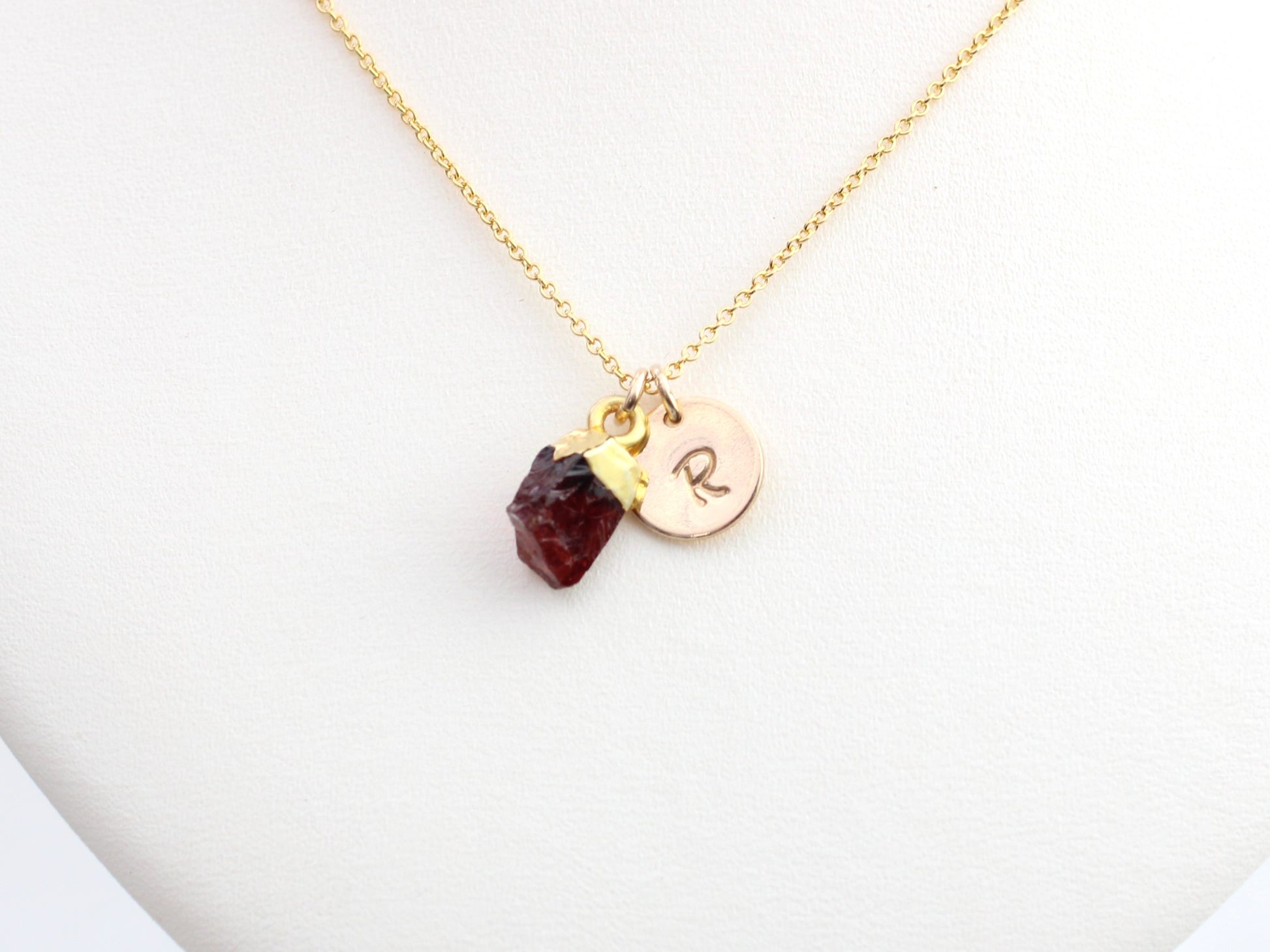 Treat yourself or a loved one to a personalised touch with our stunning garnet necklace in gold. Each necklace features a raw garnet stone on a delicate, gold-filled chain, making it the perfect accessory for a January birthday. This initial necklace can be personalised with 1 initial.