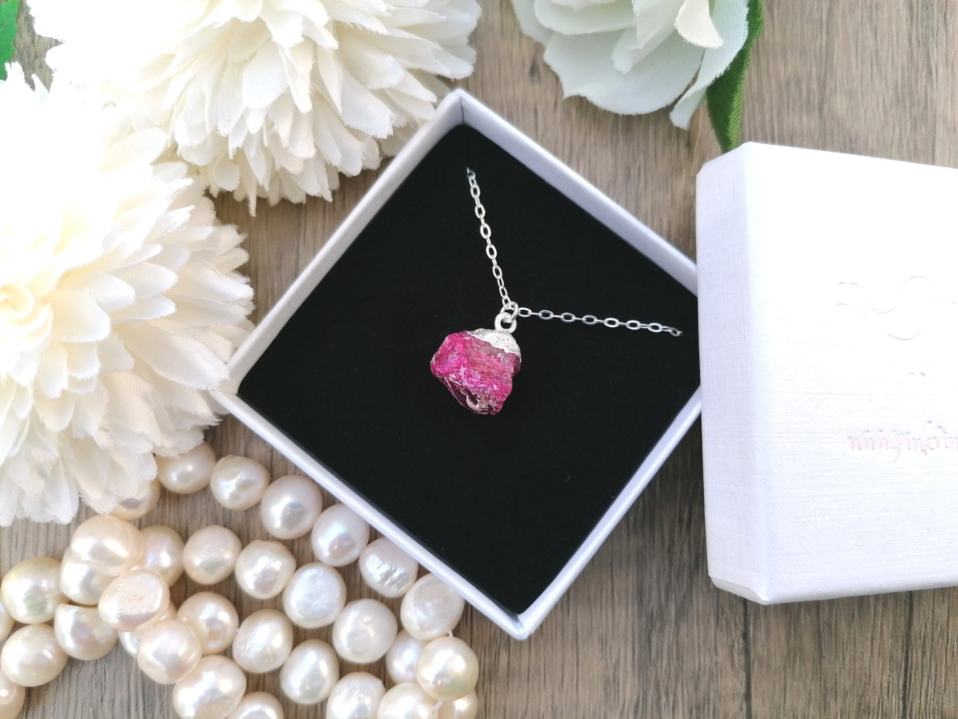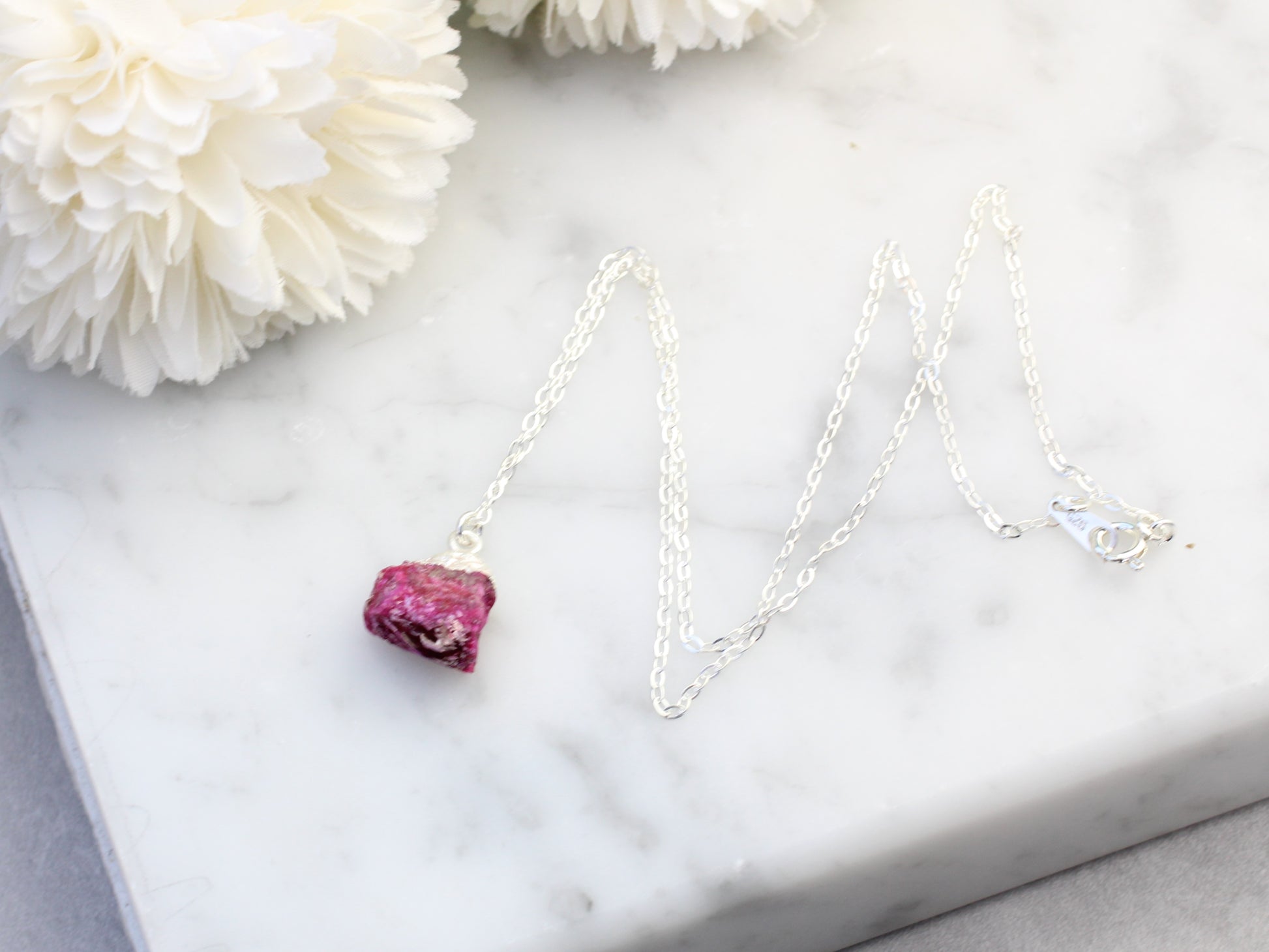 Indulge in the captivating beauty of our Raw Ruby Necklace. The July birthstone is showcased in its natural form, electroplated in lustrous sterling silver. This high quality Italian chain adds a touch of elegance to any outfit. A must-have for those who appreciate the unique and raw beauty of gemstones.