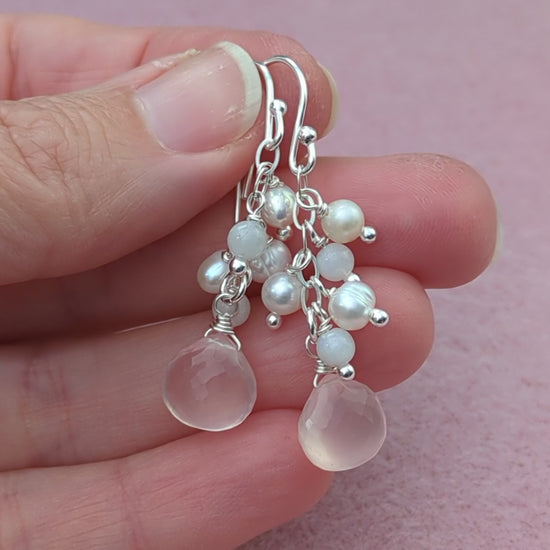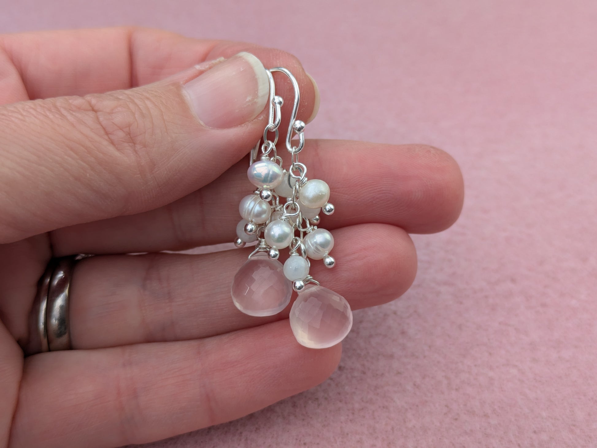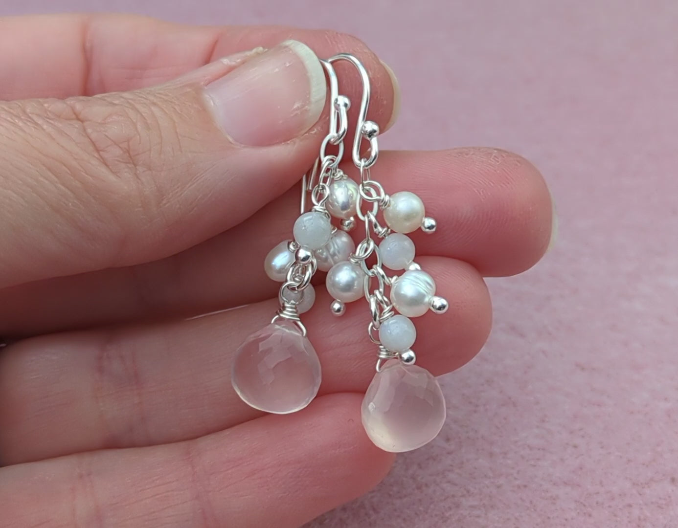 These beautiful earrings feature grade AAA rose quartz briolette gemstones expertly wire wrapped with sterling silver wire. The wire wraps also showcase moonstones and pearls for a unique and stunning look. Bring the healing properties of rose quartz and the calming energy of moonstone into your everyday style. If you would like to see these rose quartz earrings being made, please click on the link to be taken to our YouTube channel.