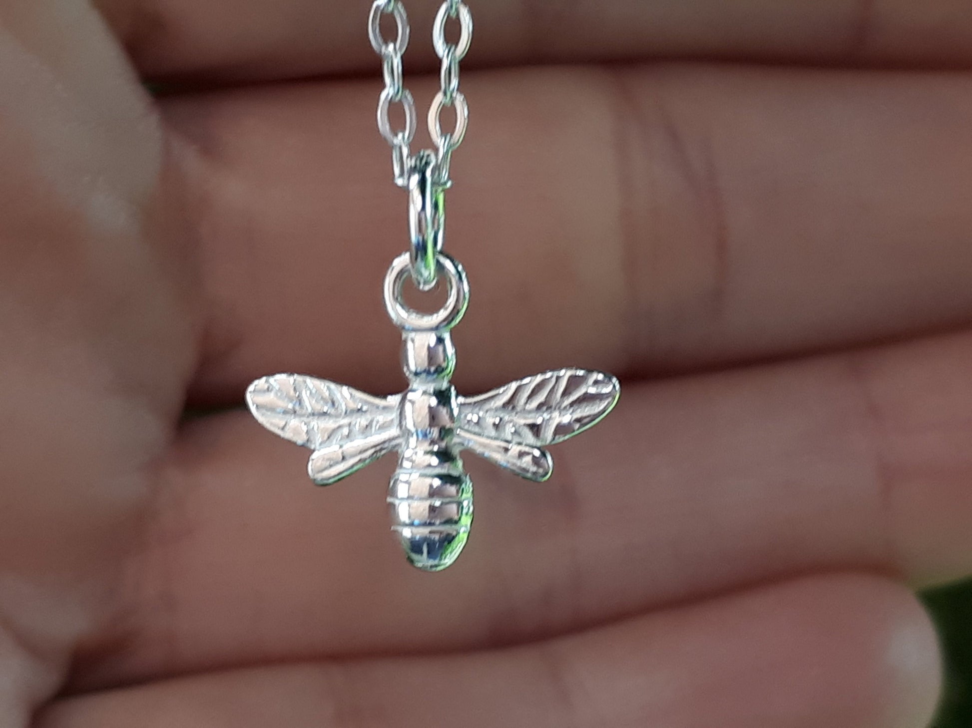 A prefect treat and a great everyday necklace. Solid sterling silver bee on a sterling silver chain. The bee measures 15 mm x 15 mm. Choose your own length of chain.