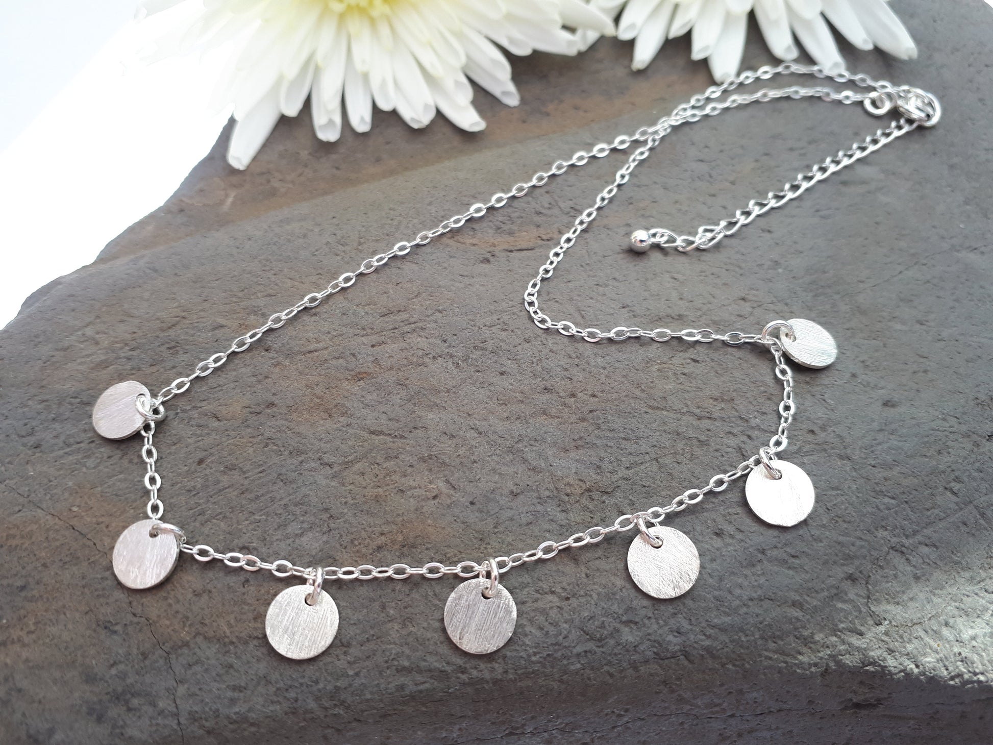 This sterling silver disc necklace stands out with its textured discs. Crafted from 925 sterling silver, its seven discs shimmer in the light, providing a subtle yet eye-catching accent to any outfit.