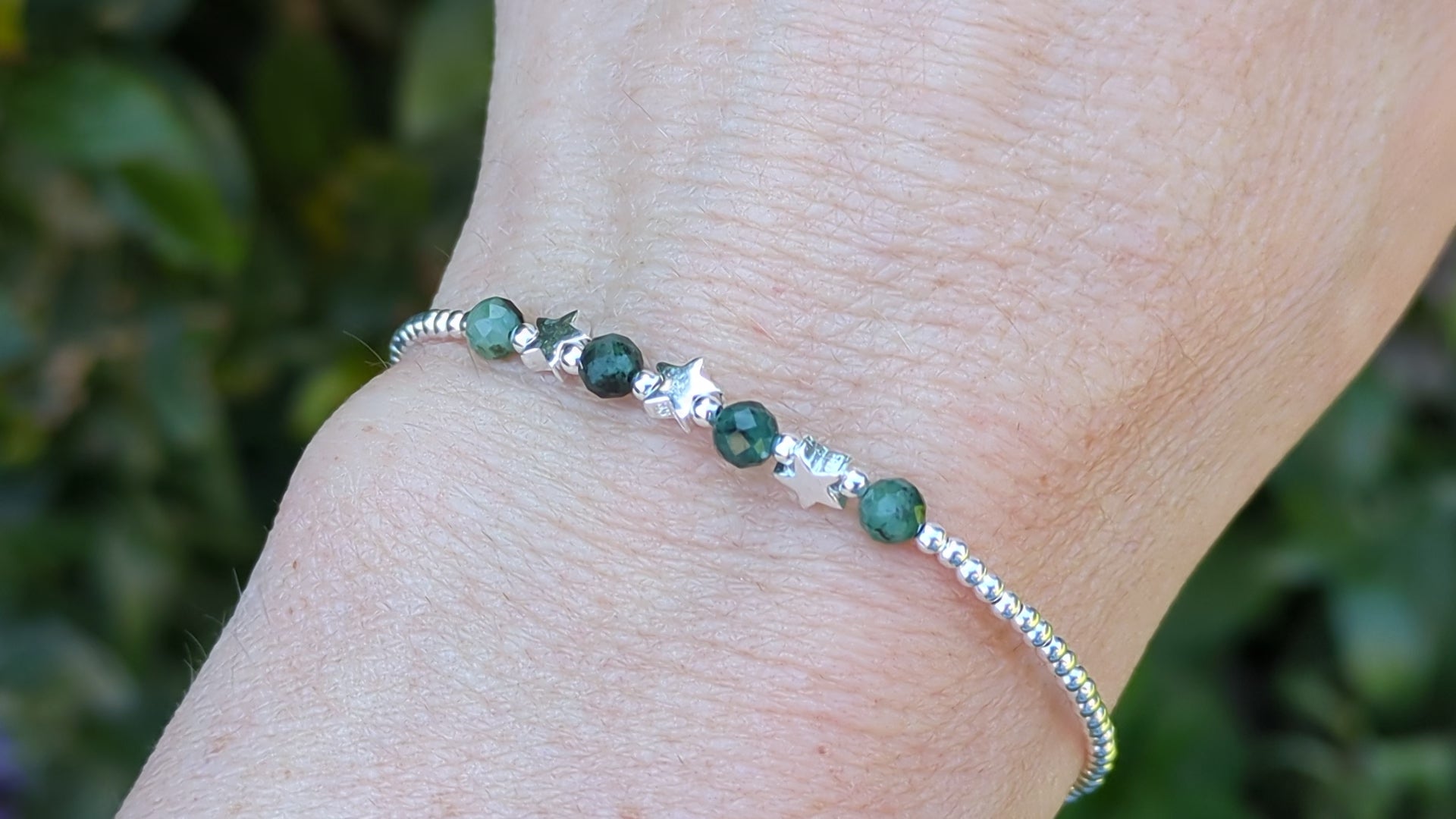 Add a touch of whimsy and elegance to your wardrobe with our silver star bracelet. Made with genuine emerald gemstones and sterling silver stars and beads, this bracelet is perfect for adding a pop of colour and sparkle to any outfit. A must-have for any jewellery lover. This bracelet can be personalised with any initial, number or zodiac sign onto a sterling silver heart charm.