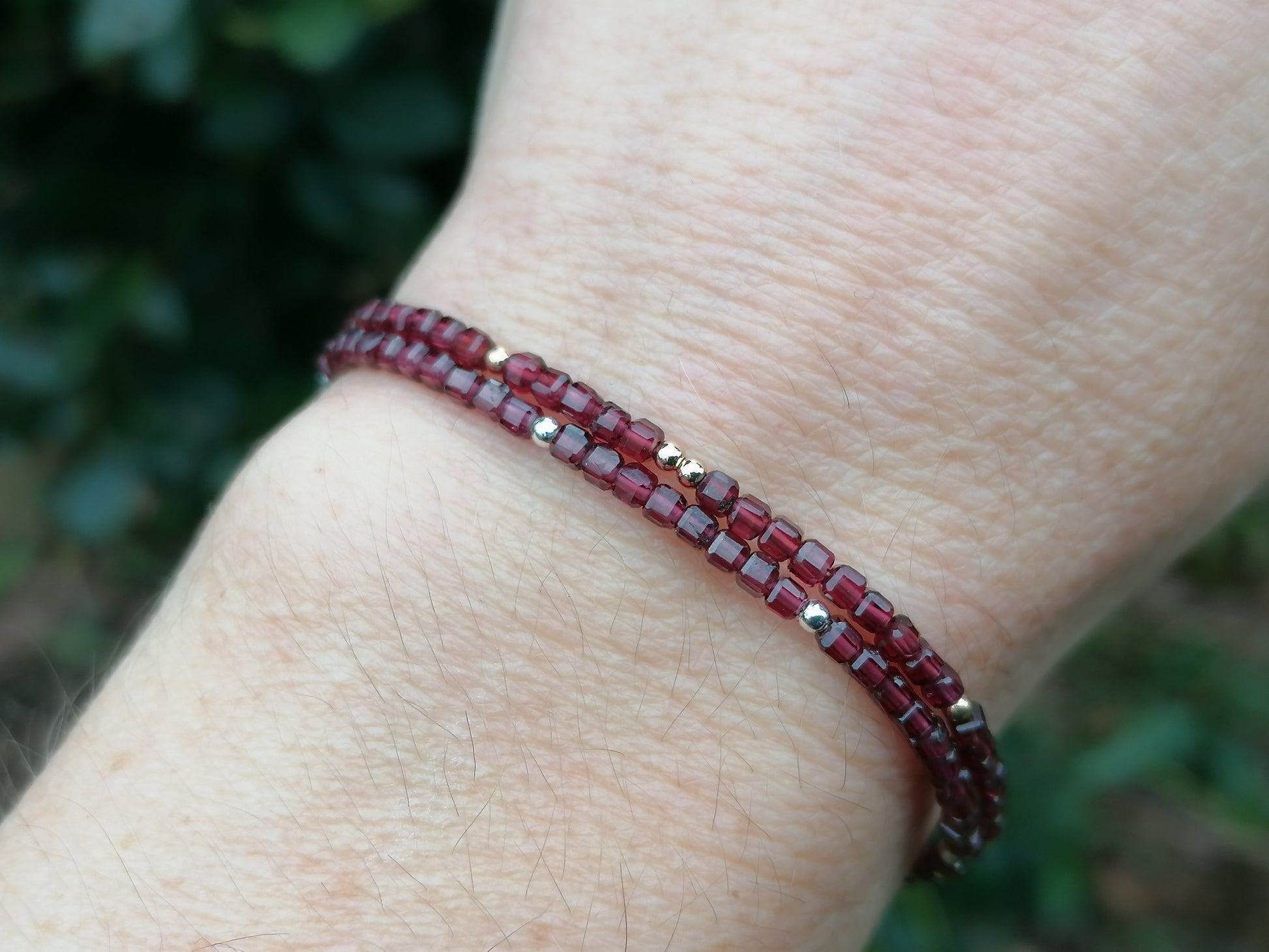 Dress up your wrists with our skinny garnet bracelet in sterling silver or gold filled! This January birthstone bracelet adds a comfortable and luxurious touch to your look.