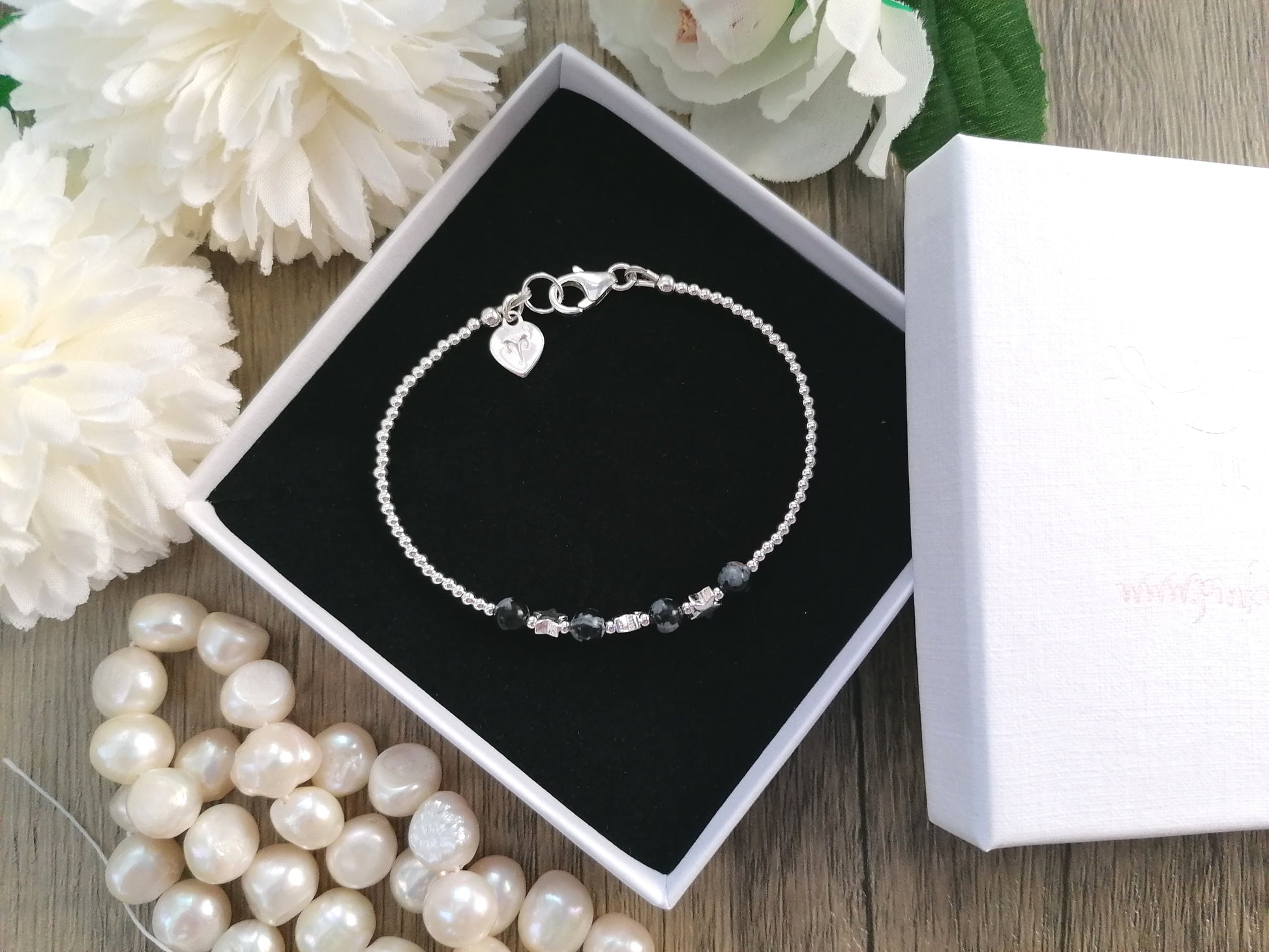 Snowflake obsidian bracelet in sterling silver with optional personalised tag - initial, number or zodiac sign.