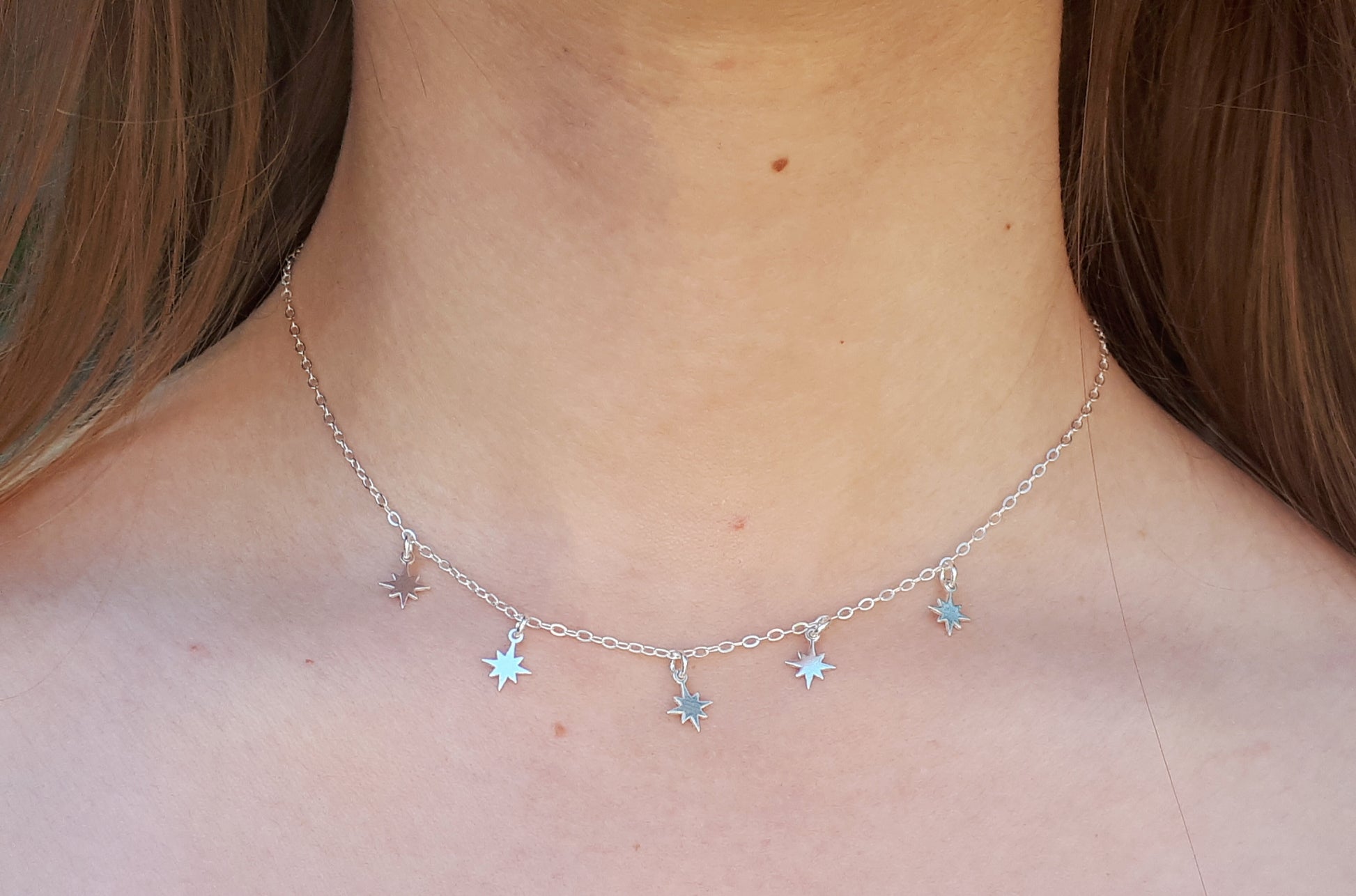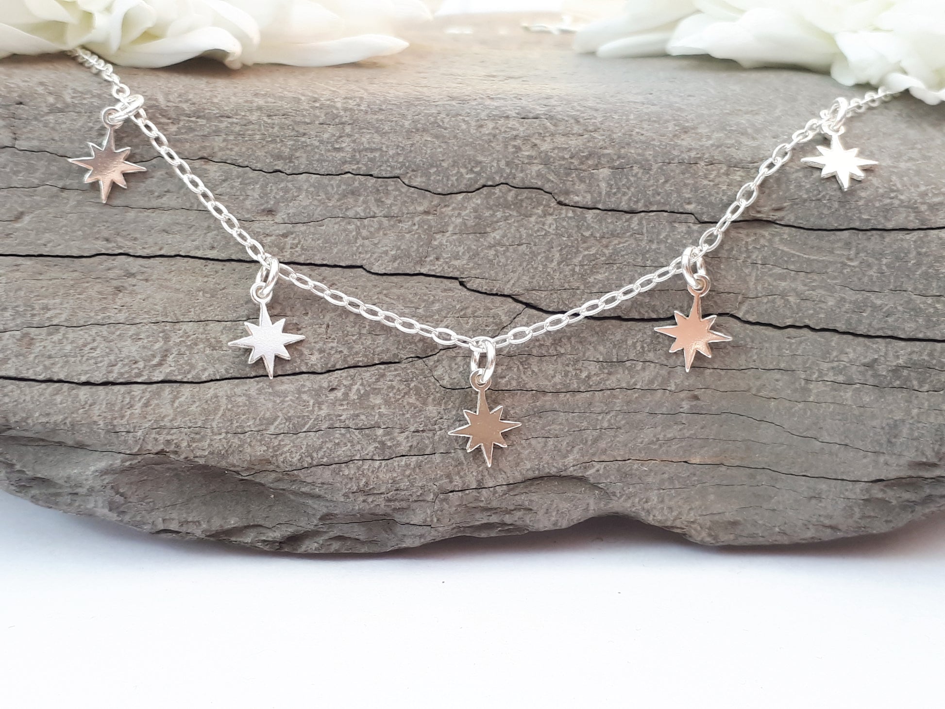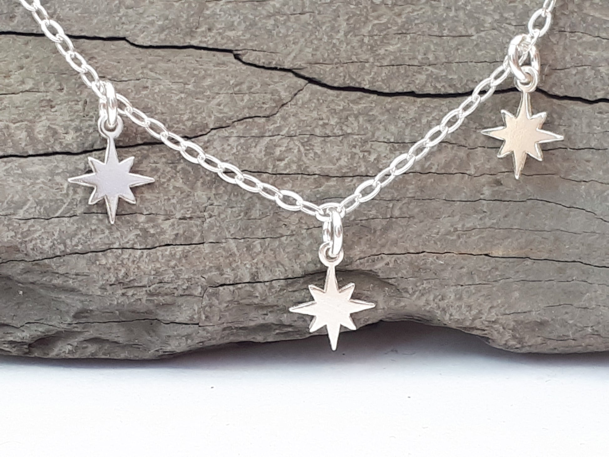 I have made this necklace using sterling silver pole stars, 9 mm in size, which have been attached to a sterling silver necklace.