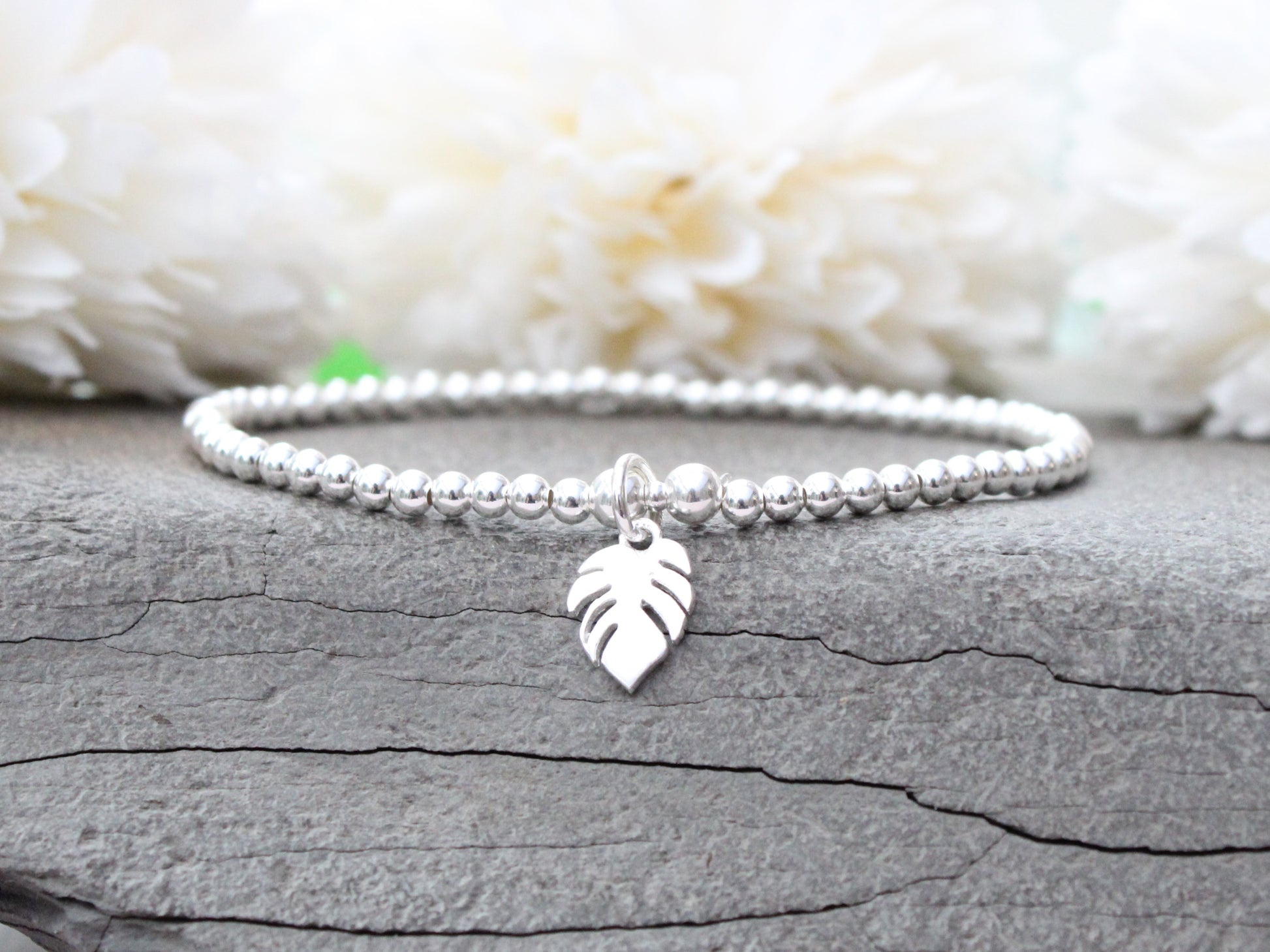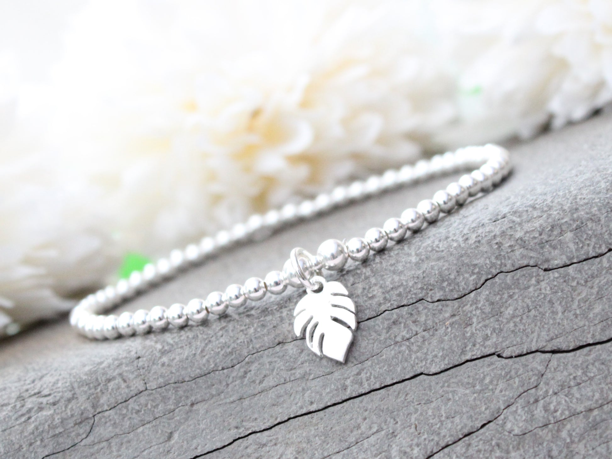 I have made this bracelet using a sterling silver monstera leaf charm and sterling silver beads which are 3 mm in size. This is a 7 inch stretch bracelet.