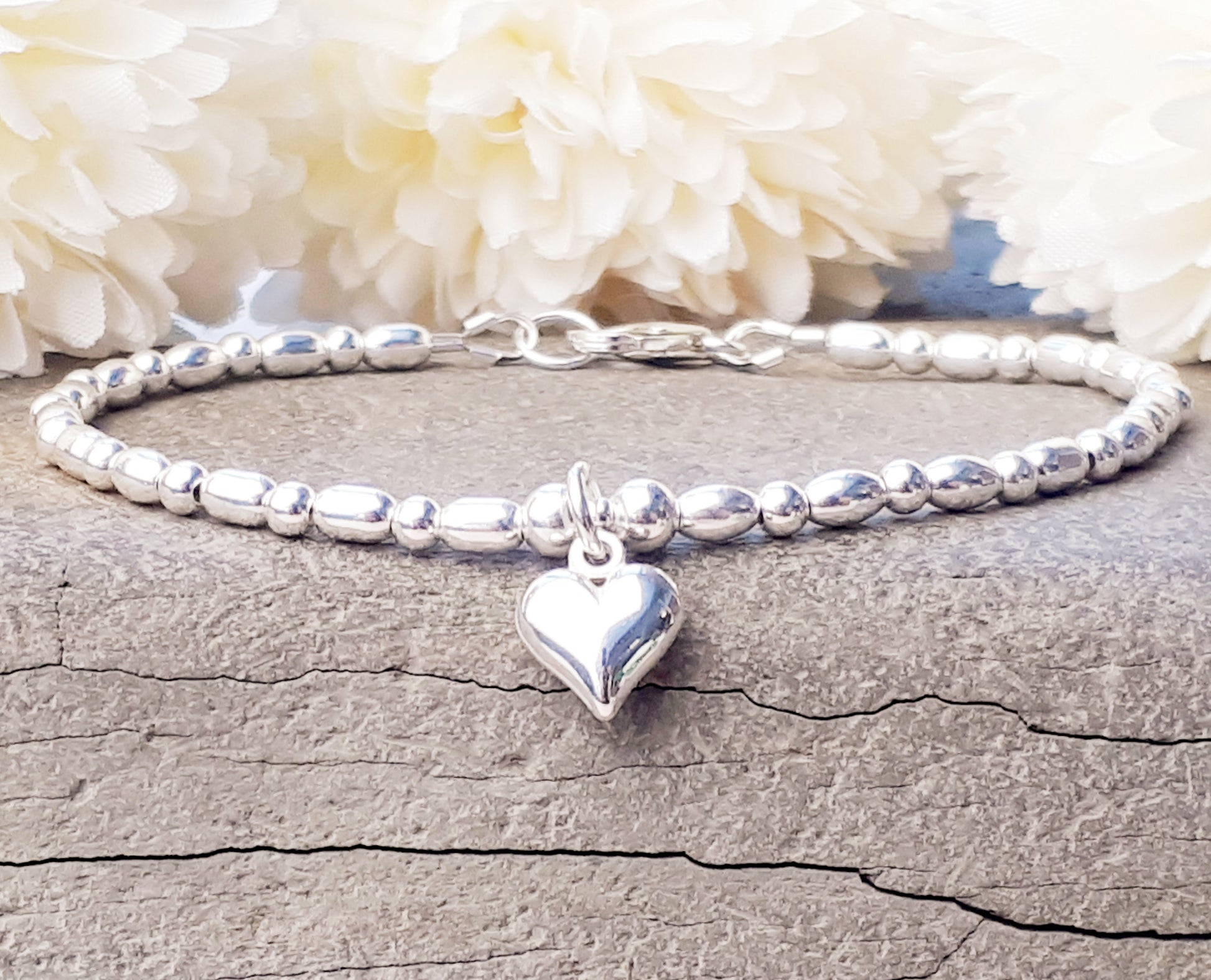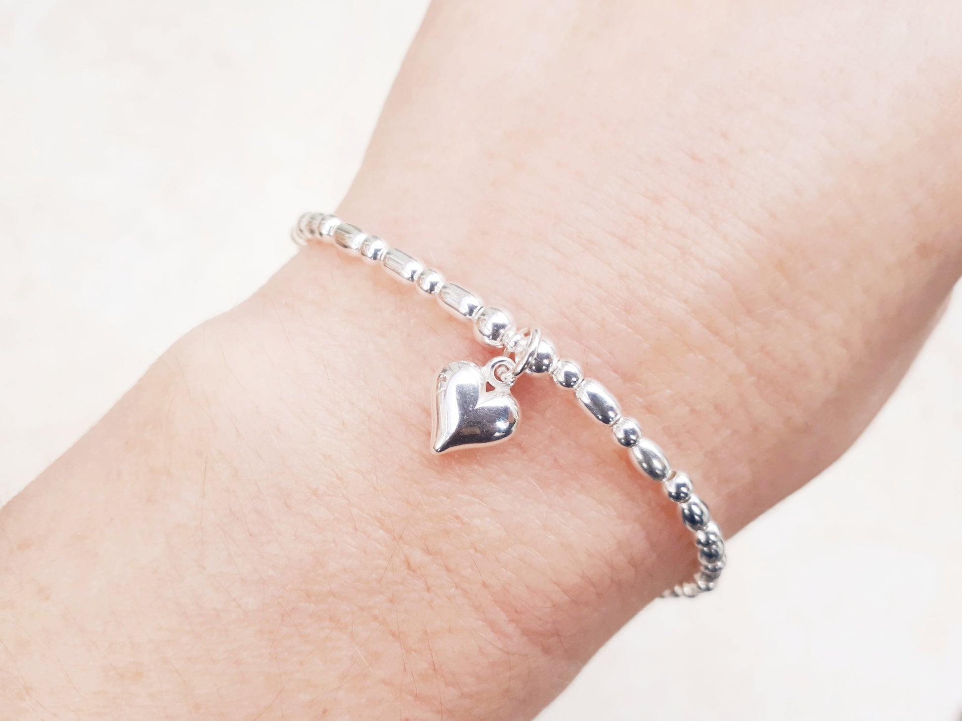 Sterling silver bead bracelet with love heart charm, can be personalised. Also available as a stretch bracelet.
