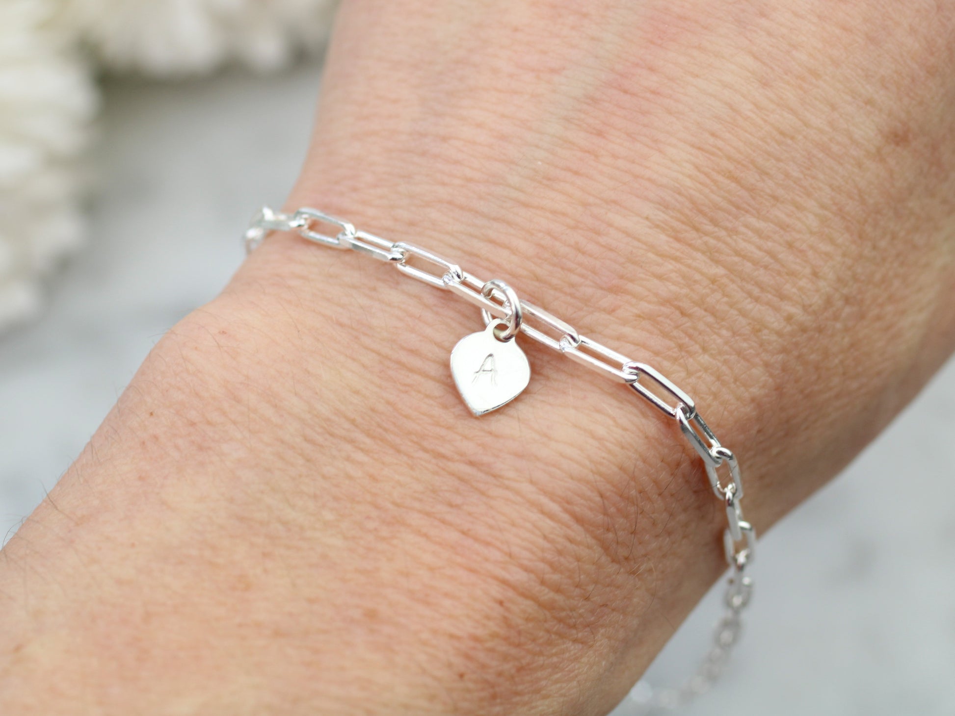 Elevate your style with our Initial bracelet. Featuring a trendy paperclip chain, a heart charm that can be hand stamped with your choice of initial, and made with high-quality sterling silver. Make it uniquely yours or give it as a thoughtful gift.