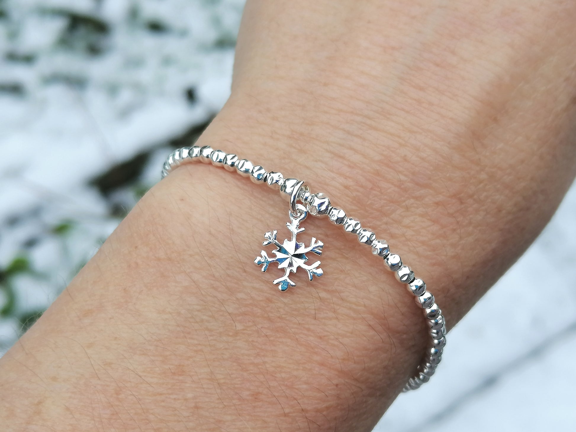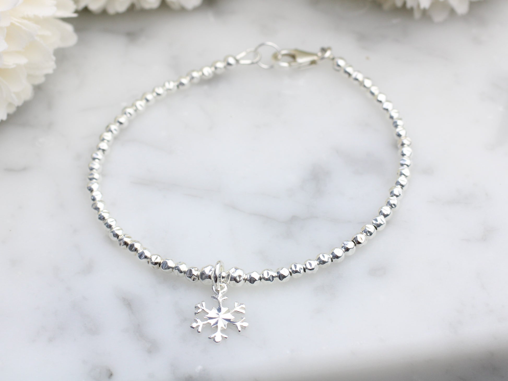 This sterling silver snowflake bracelet features a delicate handmade design with hammered beads and a beautiful snowflake charm. For a personal touch, you can add an initial, number, or zodiac sign of your choice. Elevate any outfit and make it uniquely yours with this stunning bracelet. We have a gorgeous pair of matching sparkly snowflake earrings to compliment this bracelet.