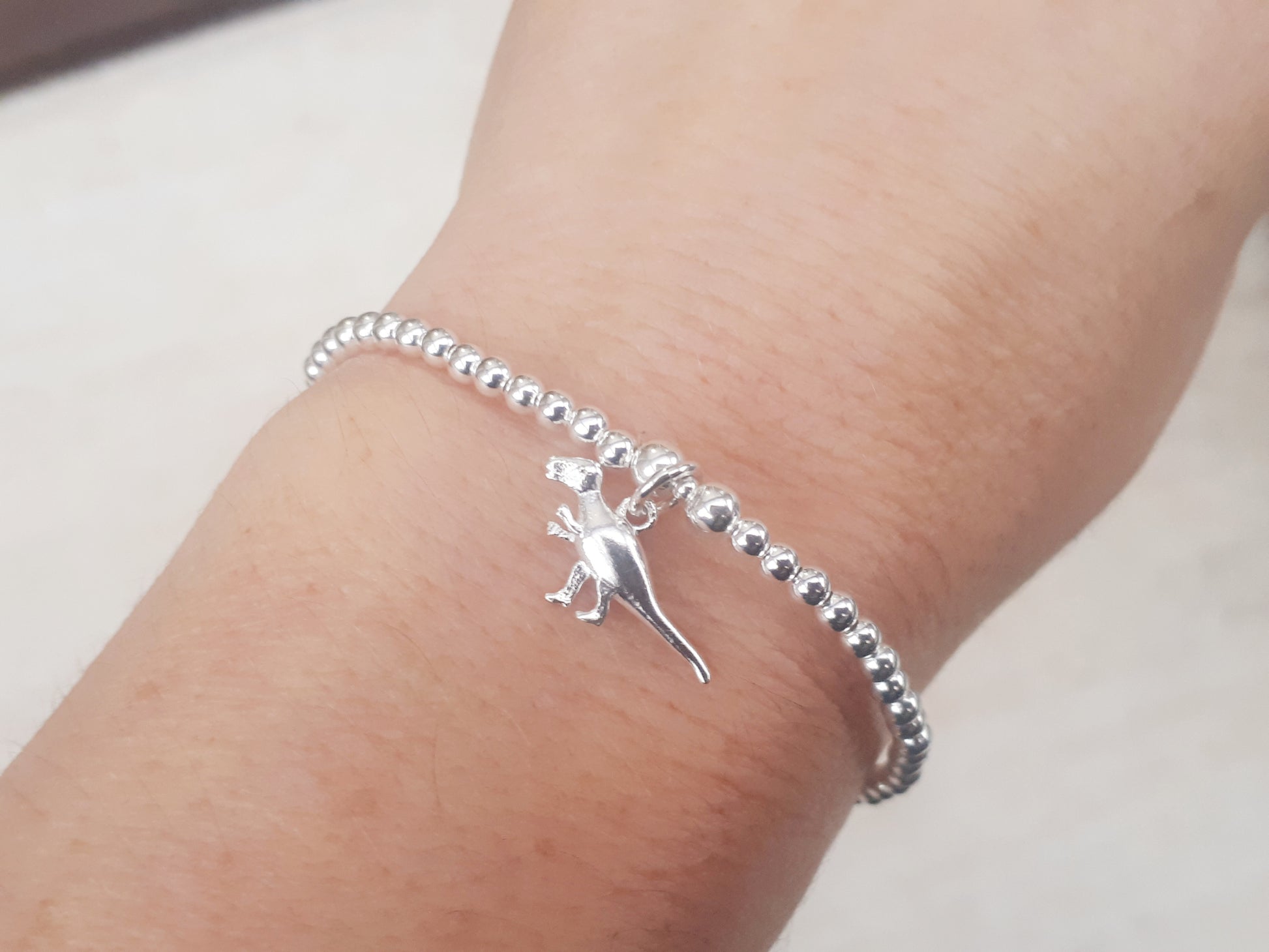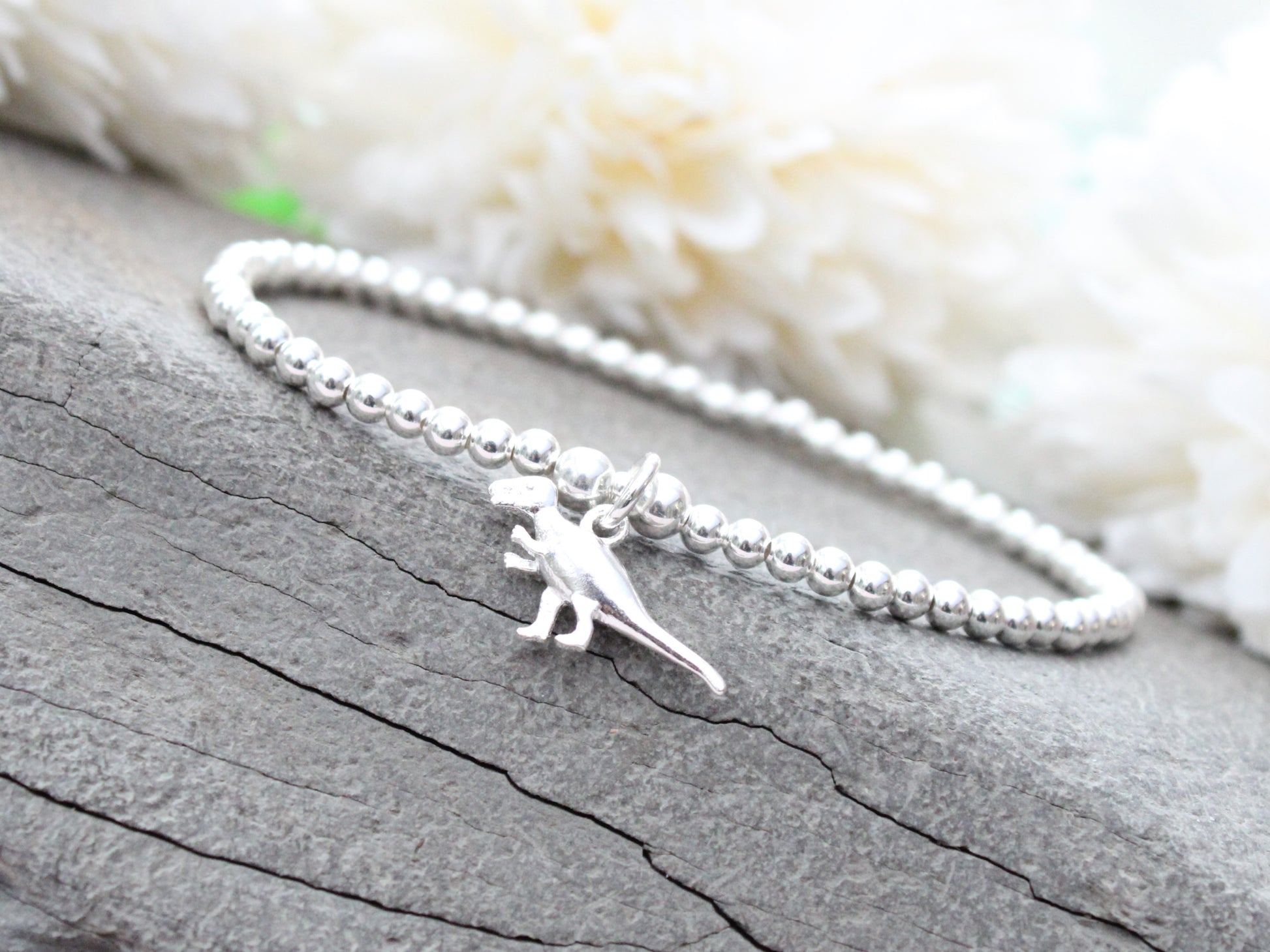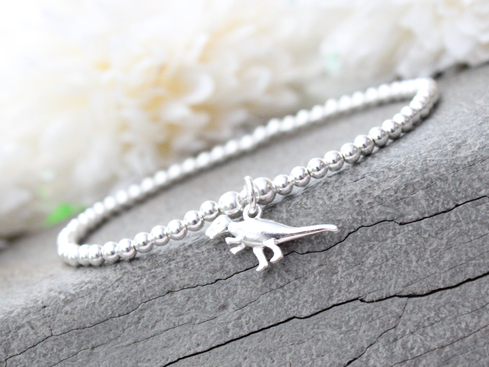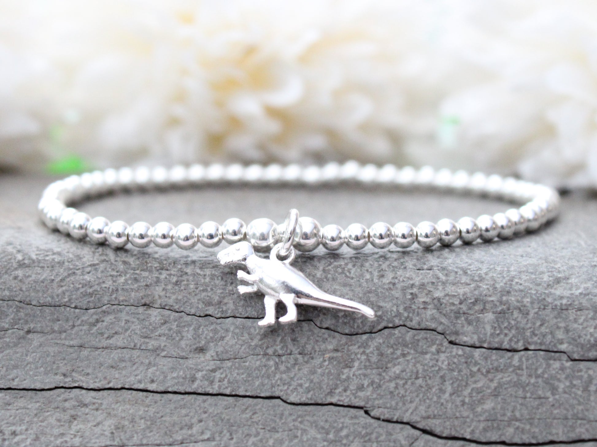 Unleash your inner fierce and stylish self with our T rex charm bracelet! Made with sterling silver beads and featuring a roaring t rex charm, this bracelet is sure to make a bold statement. Add some roarsome energy to your accessory collection today.
